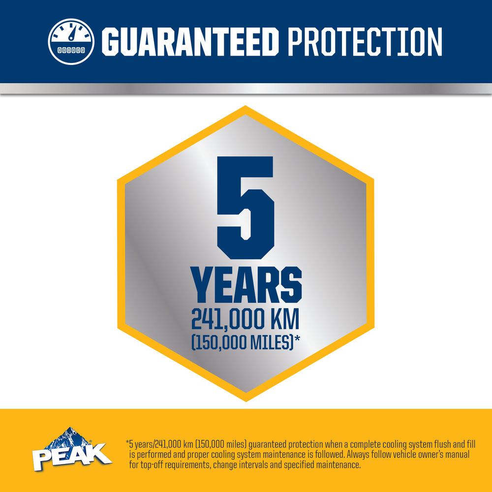 PEAK® ORIGINAL EQUIPMENT TECHNOLOGY™ ANTIFREEZE + COOLANT for NORTH AMERICAN VEHICLES - GOLD is free of phosphate, amines and 2-ethyl hexanoic acid (2-EHA) and is safe for non-metallic cooling system components. It is fully compatible with other gold hybrid coolants and meets the performance requirements of ASTM D3306, D4985 and D6210. With a complete flush and fill, PEAK guarantees this coolant will provide the service life specified by the OEMs utilizing this specific technology, typically up to 5 years or 150,000 miles*.