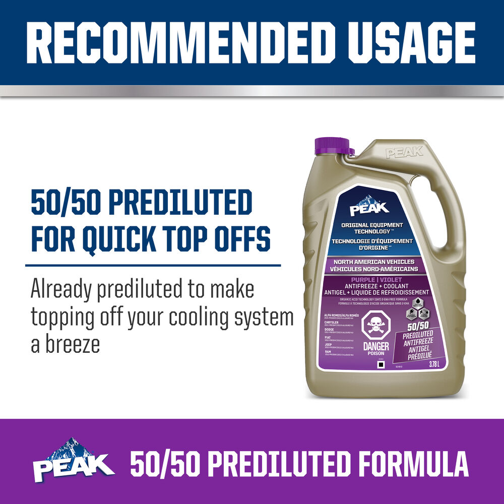 PEAK® ORIGINAL EQUIPMENT TECHNOLOGY™ ANTIFREEZE + COOLANT for NORTH AMERICAN VEHICLES - PURPLE is an extended life antifreeze/coolant based on proprietary state-of-the-art organic acid technology (OAT). The ethylene glycol-based formula represents a carefully balanced mixture of organic acid corrosion inhibitors for complete protection of modern high-performance North American vehicle engines. It can be mixed with any purple colored Organic Acid Technology (OAT) coolant in newer Alfa Romeo, Chrysler, Dodge, Fiat, Jeep, and RAM vehicles, as well as with antifreeze/coolant in vehicles requiring a purple colored OAT coolant. This product’s purple color distinguishes its unique chemistry and ensures easy selection for North American vehicles requiring this type and color of coolant.