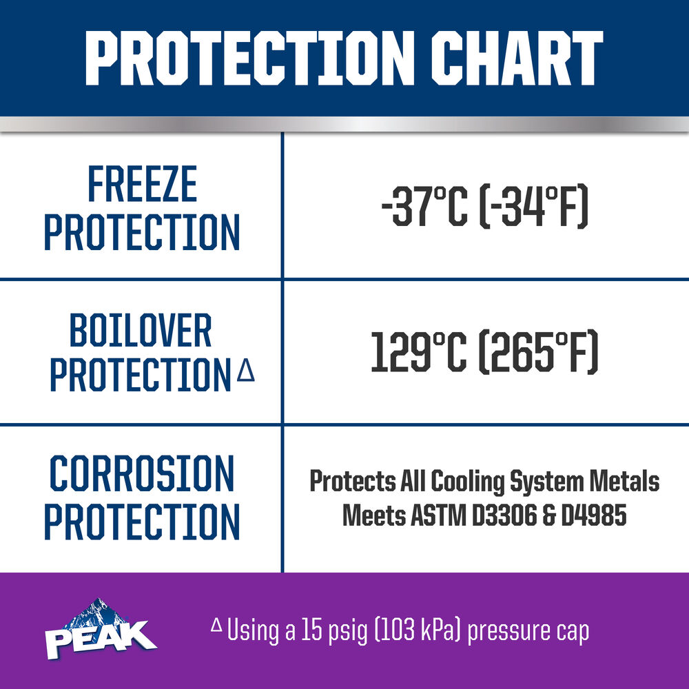 PEAK® ORIGINAL EQUIPMENT TECHNOLOGY™ ANTIFREEZE + COOLANT for NORTH AMERICAN VEHICLES - PURPLE meets the Organic Acid Technology (OAT) formula requirements of North American OEMs that require 2-EHA Free Antifreeze + Coolant formulations. Meets or exceeds the performance requirements of ASTM D3306 and ASTM D4985. Provides ultimate protection against rust and corrosion for all cooling system metals. PEAK® guarantees up to 15 years/350,000 mile* protection with a complete cooling system flush and fill.