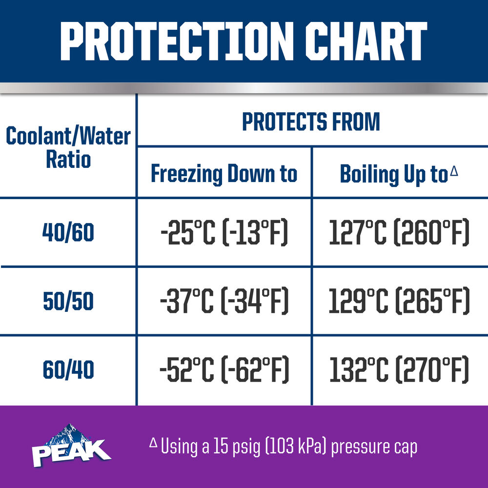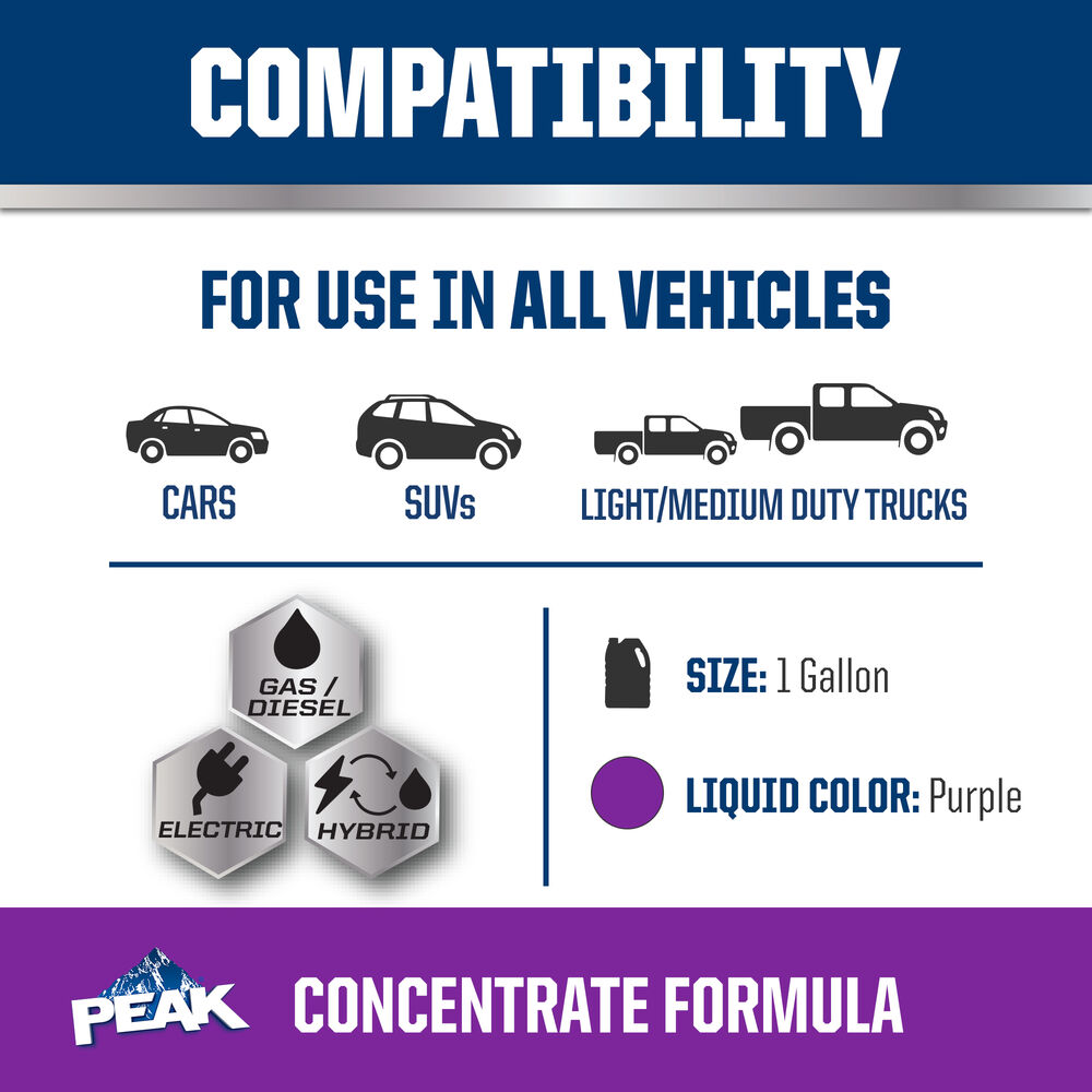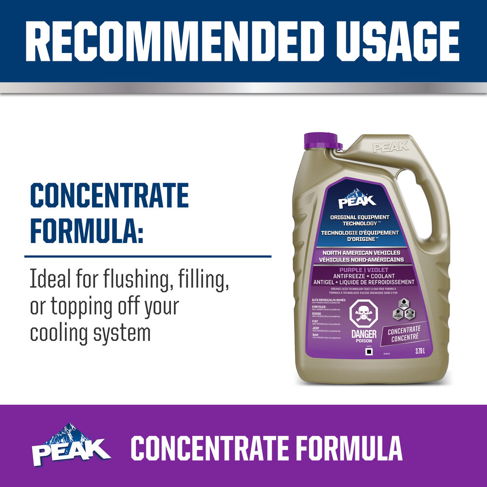 PEAK® ORIGINAL EQUIPMENT TECHNOLOGY™ ANTIFREEZE + COOLANT for NORTH AMERICAN VEHICLES - PURPLE is an extended life antifreeze/coolant based on proprietary state-of-the-art organic acid technology (OAT). The ethylene glycol-based formula represents a carefully balanced mixture of organic acid corrosion inhibitors for complete protection of modern high-performance North American vehicle engines. It can be mixed with any purple colored Organic Acid Technology (OAT) coolant in newer Alfa Romeo, Chrysler, Dodge, Fiat, Jeep, and RAM vehicles, as well as with antifreeze/coolant in vehicles requiring a purple colored OAT coolant. This product’s purple color distinguishes its unique chemistry and ensures easy selection for North American vehicles requiring this type and color of coolant.