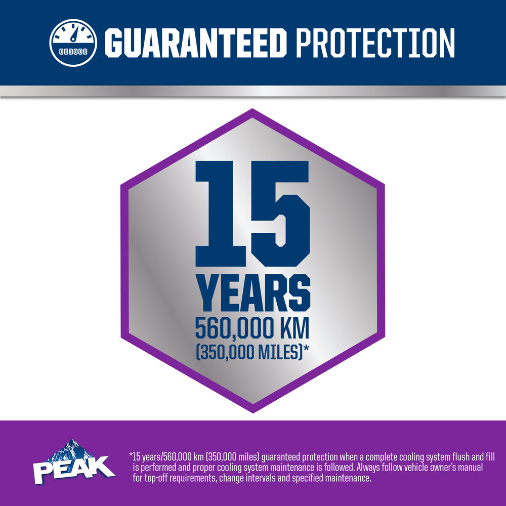 PEAK® ORIGINAL EQUIPMENT TECHNOLOGY™ ANTIFREEZE + COOLANT for NORTH AMERICAN VEHICLES - PURPLE meets the Organic Acid Technology (OAT) formula requirements of North American OEMs that require 2-EHA Free Antifreeze + Coolant formulations. Meets or exceeds the performance requirements of ASTM D3306 and ASTM D4985. Provides ultimate protection against rust and corrosion for all cooling system metals. PEAK® guarantees up to 15 year/350,000 mile* protection with a complete cooling system flush and fill.
