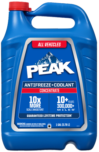 El anticongelante + refrigerante PEAK® está formulado para usarse en todas las marcas y modelos de vehículos y está especialmente diseñado para brindar una protección superior garantizada de por vida*. Su fórmula universal avanzada contiene una mezcla patentada de 10 veces más de inhibidores† que combaten el sarro, junto con aditivos orgánicos sólidos para combatir los efectos dañinos de los depósitos de sarro y la corrosión. El anticongelante + refrigerante PEAK® no contiene 2-EHA, silicato, nitrito, borato y sustancias químicas aminas, lo que garantiza el máximo rendimiento del sistema de refrigeración durante más de 10 años/más de 300,000 millas*. Es compatible para su uso con cualquier color o tipo de anticongelante/refrigerante en el sistema.