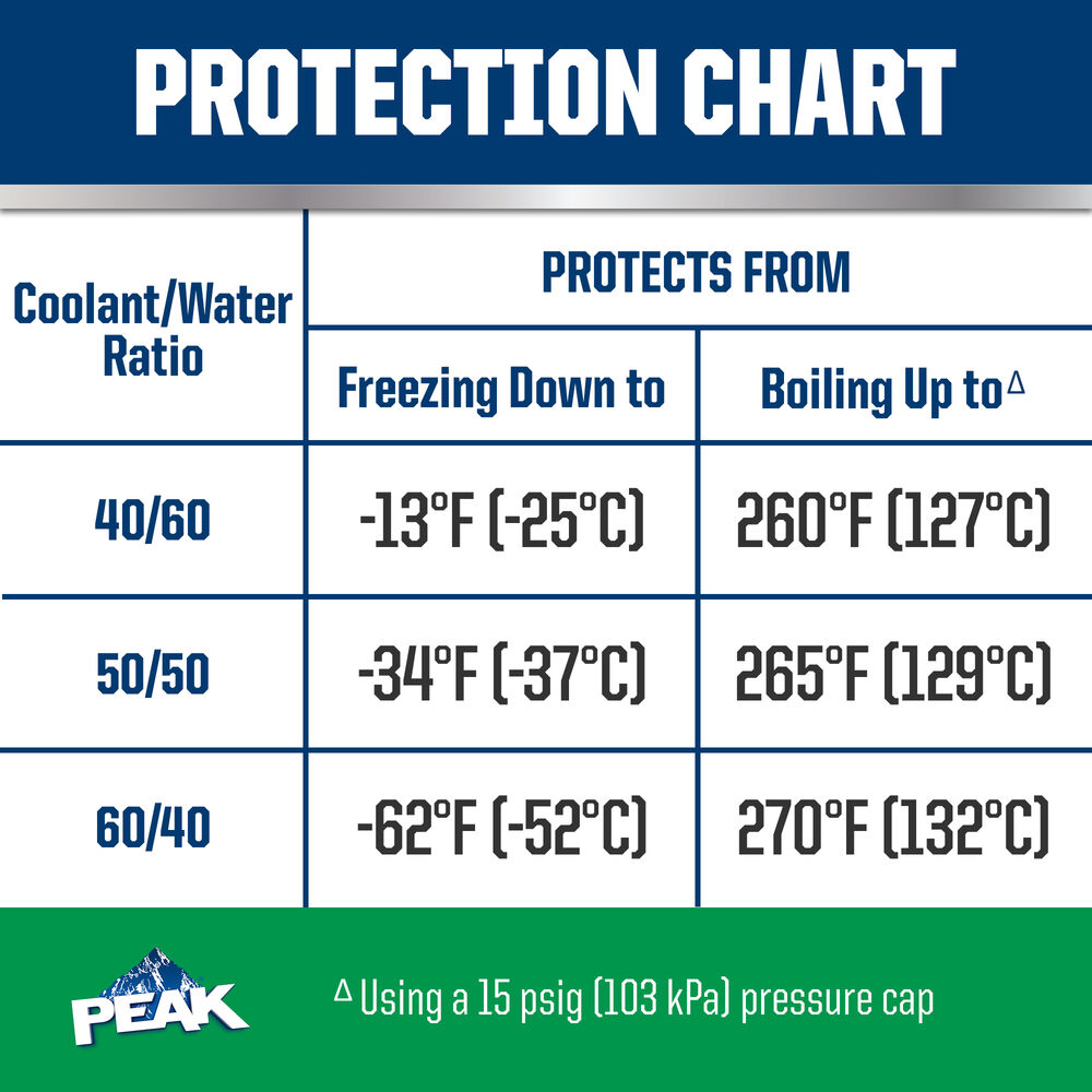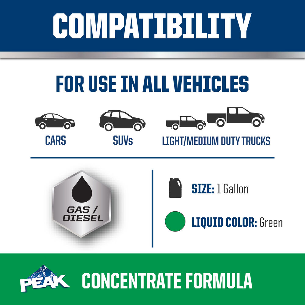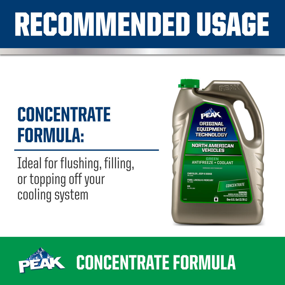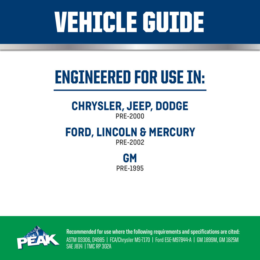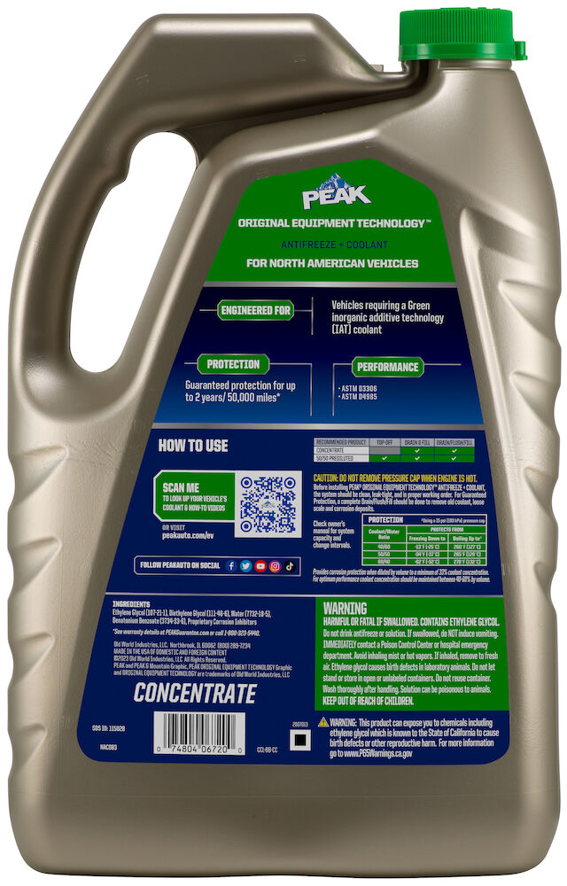 El ANTICONGELANTE + REFRIGERANTE PEAK ORIGINAL EQUIPMENT TECHNOLOGY para VEHÍCULOS NORTEAMERICANOS - VERDE es totalmente compatible con otros refrigerantes convencionales verdes y cumple con los requisitos de rendimiento D3306 y D4985 de la ASTM. Con una descarga completa y llenado, PEAK garantiza que este refrigerante proporcionará la vida útil especificada por los OEM que utilizan esta tecnología específica, por lo general hasta 2 años o 50,000 millas. Use ANTICONGELANTE + REFRIGERANTE de potencia completa (concentrado) PEAK ORIGINAL EQUIPMENT TECHNOLOGY para realizar una descarga/un llenado completo o una recarga.