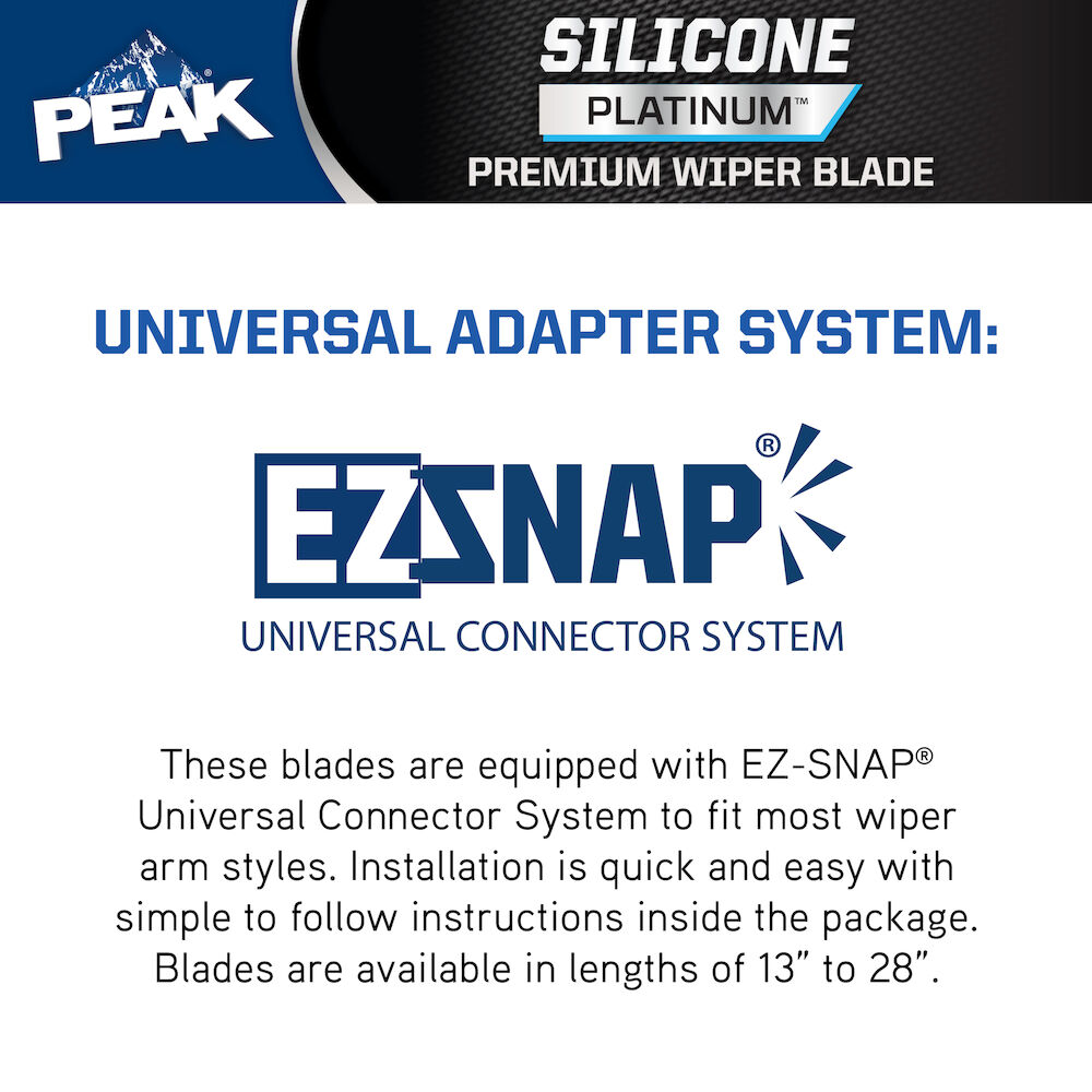 DÓNDE COMPRARPEAK® SILICONE PLATINUM™es nuestra escobilla limpiaparabrisas de primera calidad, diseñada para durar 4 veces más* y ofrecer una visibilidad completa en todas las estaciones. La tecnología del elemento de limpieza de cuatro capas está fabricada con un compuesto de silicona para una mayor durabilidad, proporcionando 2 millones de pasadas sin problemas* durante la vida útil de la escobilla. La tecnología repelente al agua infundida recubre el parabrisas y repele la lluvia y el rocío de la carretera en invierno. El uso de la tecnología TalcLife™, un recubrimiento de talco patentado, garantiza la limpieza más suave posible. Cambie por una escobilla limpiaparabrisas de gama alta que resiste todas las estaciones con las escobillas limpiaparabrisas PEAK® SILICONE PLATINUM. Estas escobillas están equipadas con el sistema de conector universal EZ-SNAP® para adaptarse a la mayoría de los estilos de brazo de limpiaparabrisas. La instalación es rápida y fácil, y viene con instrucciones fáciles de seguir dentro del paquete. Las escobillas están disponibles en longitudes de 13” a 28”.