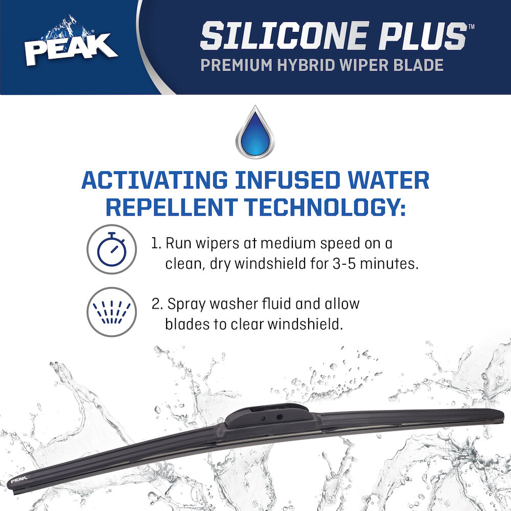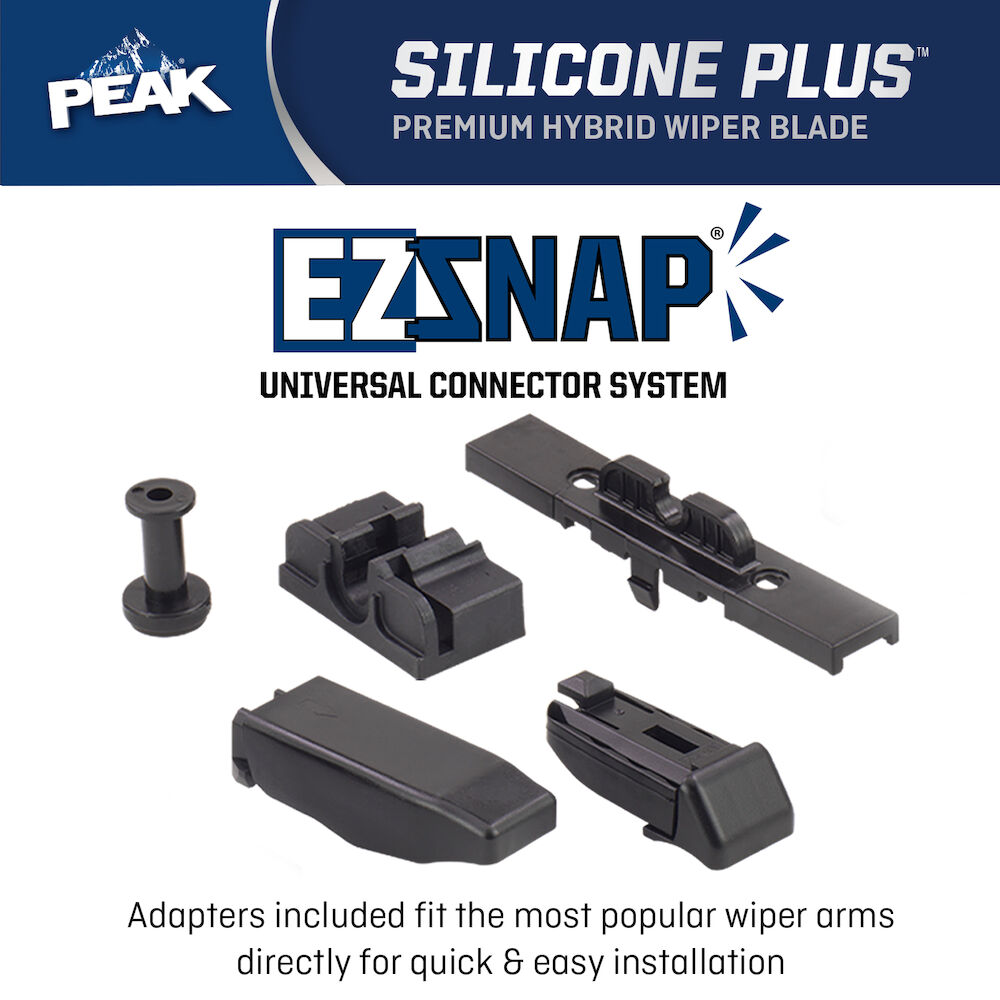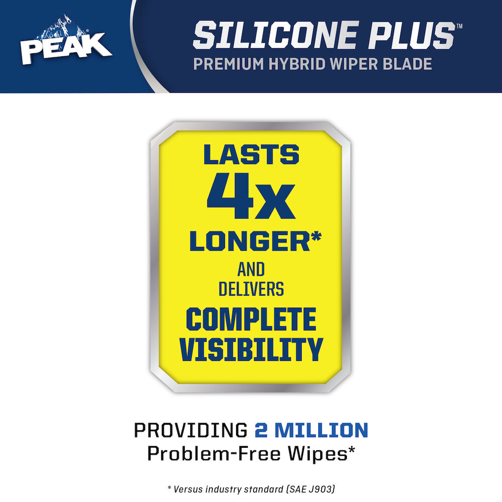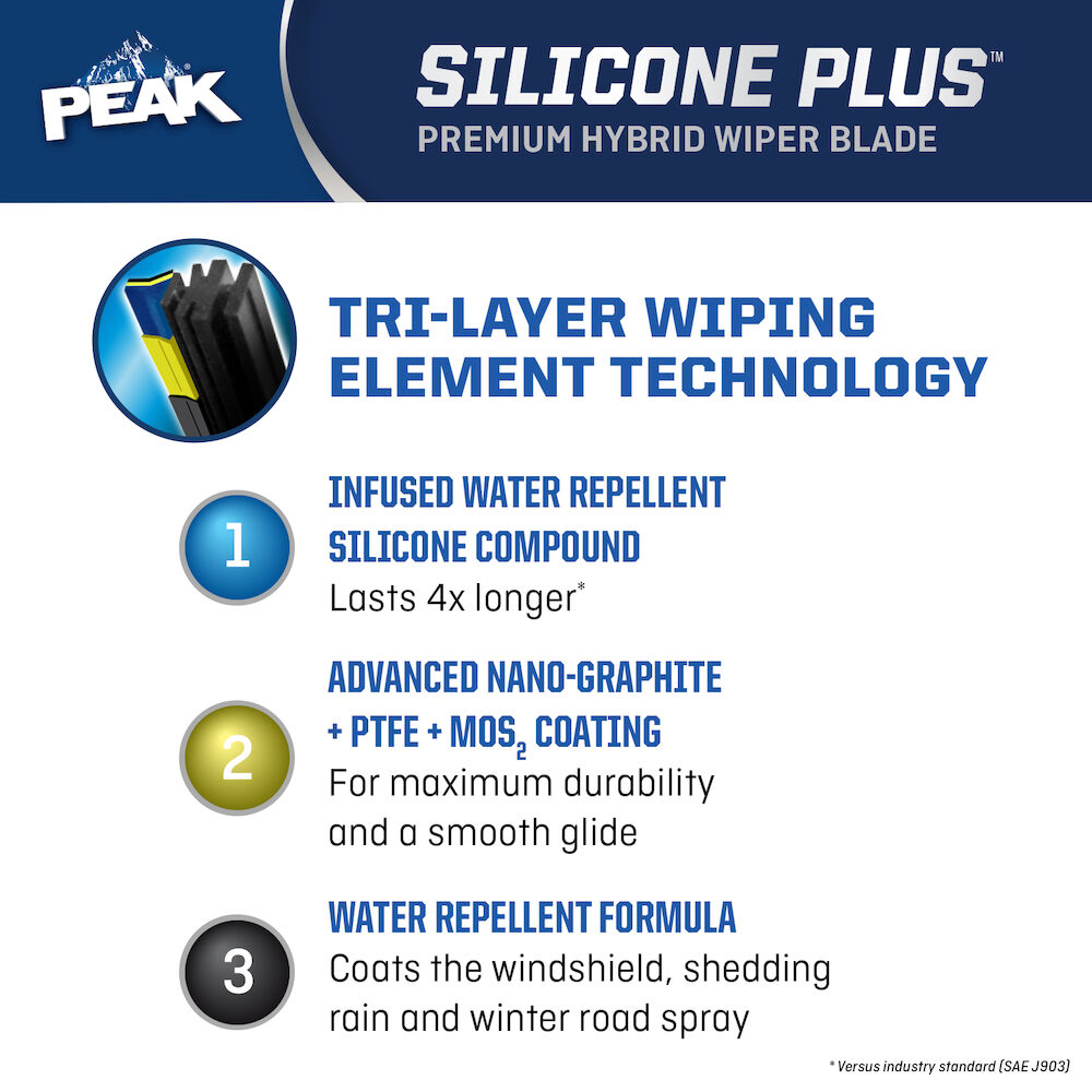 DÓNDE COMPRARLa escobilla limpiaparabrisas PEAK® SILICONE PLUS™ está diseñada para durar 4 veces más y ofrece una visibilidad completa. El elemento limpiador de tres capas está construido con un compuesto de silicona para una larga vida útil, recubrimiento avanzado de nano-grafito PTFE + MoS2 que proporciona máxima durabilidad y deslizamiento suave, y una fórmula impermeable infundida recubre el parabrisas, la lluvia y el rocío de carretera de invierno. Esta hoja ofrece un rendimiento para todas las estaciones, mientras que el diseño híbrido proporciona la fuerza descendente necesaria para el contacto total y la distribución uniforme de los puntos de presión en la superficie del área del limpiaparabrisas, lo que garantiza una limpieza limpia durante la vida útil de la hoja. La hoja PEAK SILICONE PLUS cuenta con un innovador sistema de conectores que se adapta a la mayoría de los brazos de la escobilla limpiaparabrisas para una instalación rápida y fácil, y se ofrece en tamaños de 13” a 28”
