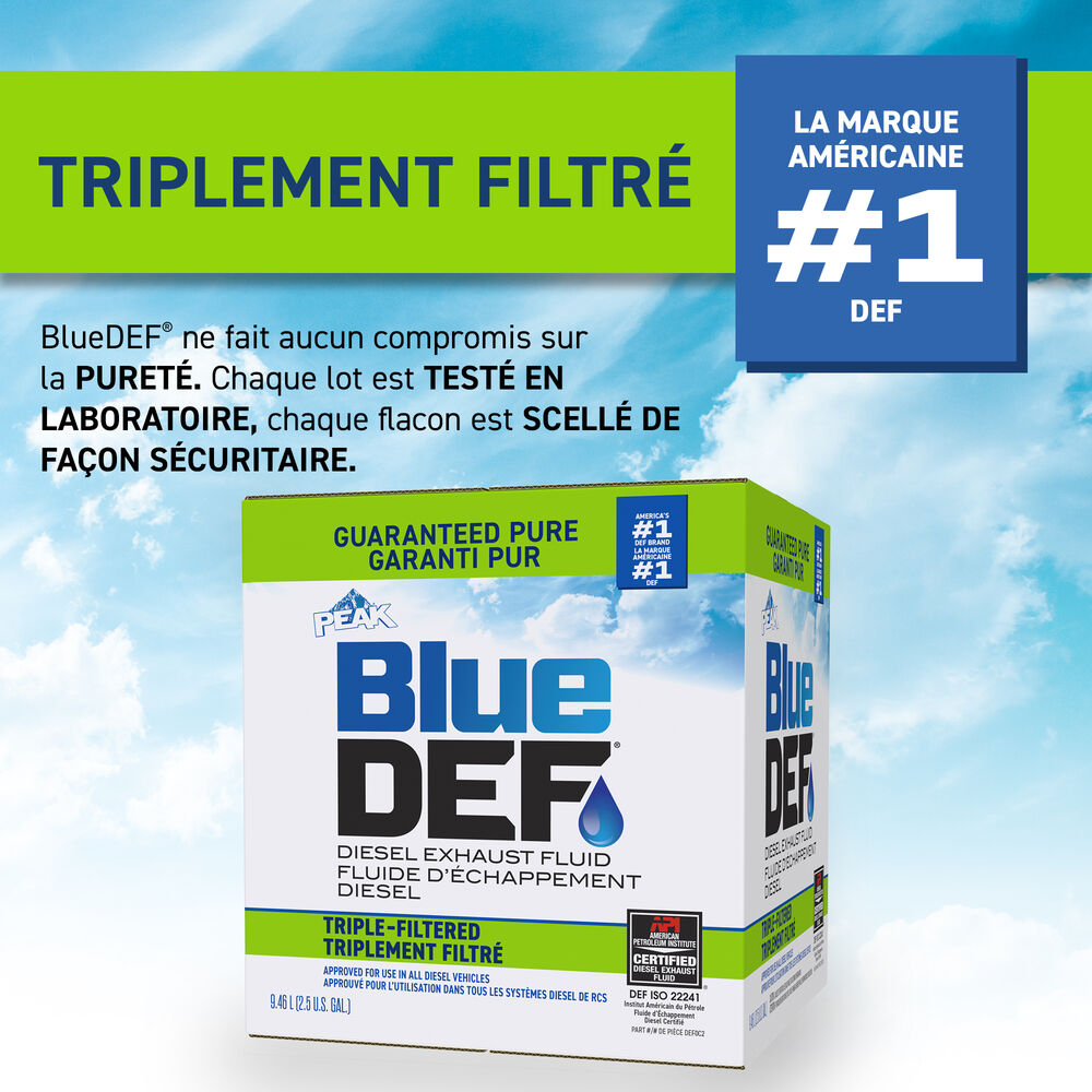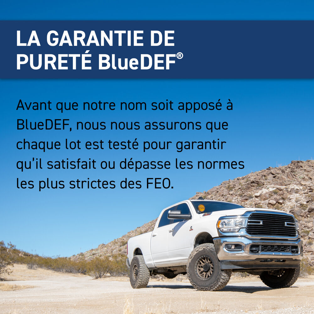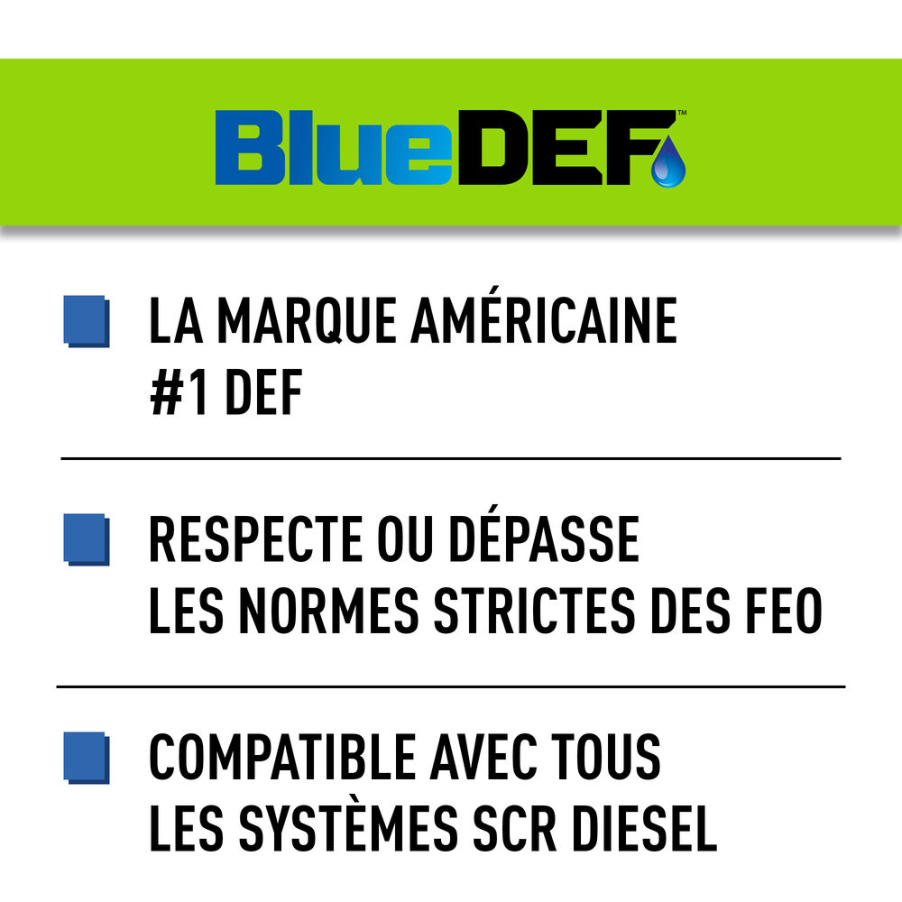 Où acheterLe fluide d’échappement diesel BlueDEFMD est un mélange d’urée synthétique de haute pureté et d’eau désionisée qui est utilisé dans les systèmes de réduction catalytique sélective (SCR) dans les véhicules diesel. Le FED est utilisé pour aider à convertir le NOx en azote et en eau inoffensifs.Le fluide d’échappement diesel (FED) est l’un des éléments clés du processus de réduction catalytique sélective (RCS) utilisé par les constructeurs de moteurs diesel pour répondre aux réglementations EPA 2010. BlueDEF est une solution non toxique d’eau purifiée à 67,5 % et d’urée de qualité automobile ultra-pure à 32,5 %. BlueDEF n’est pas un carburant ni un additif de carburant. Au lieu de cela, lorsqu’il est injecté dans le flux d’échappement et passé sur un catalyseur, BlueDEF aide à convertir les NOx en gaz azotés et en vapeur d’eau – deux composants naturels et inoffensifs de l’air que nous respirons.