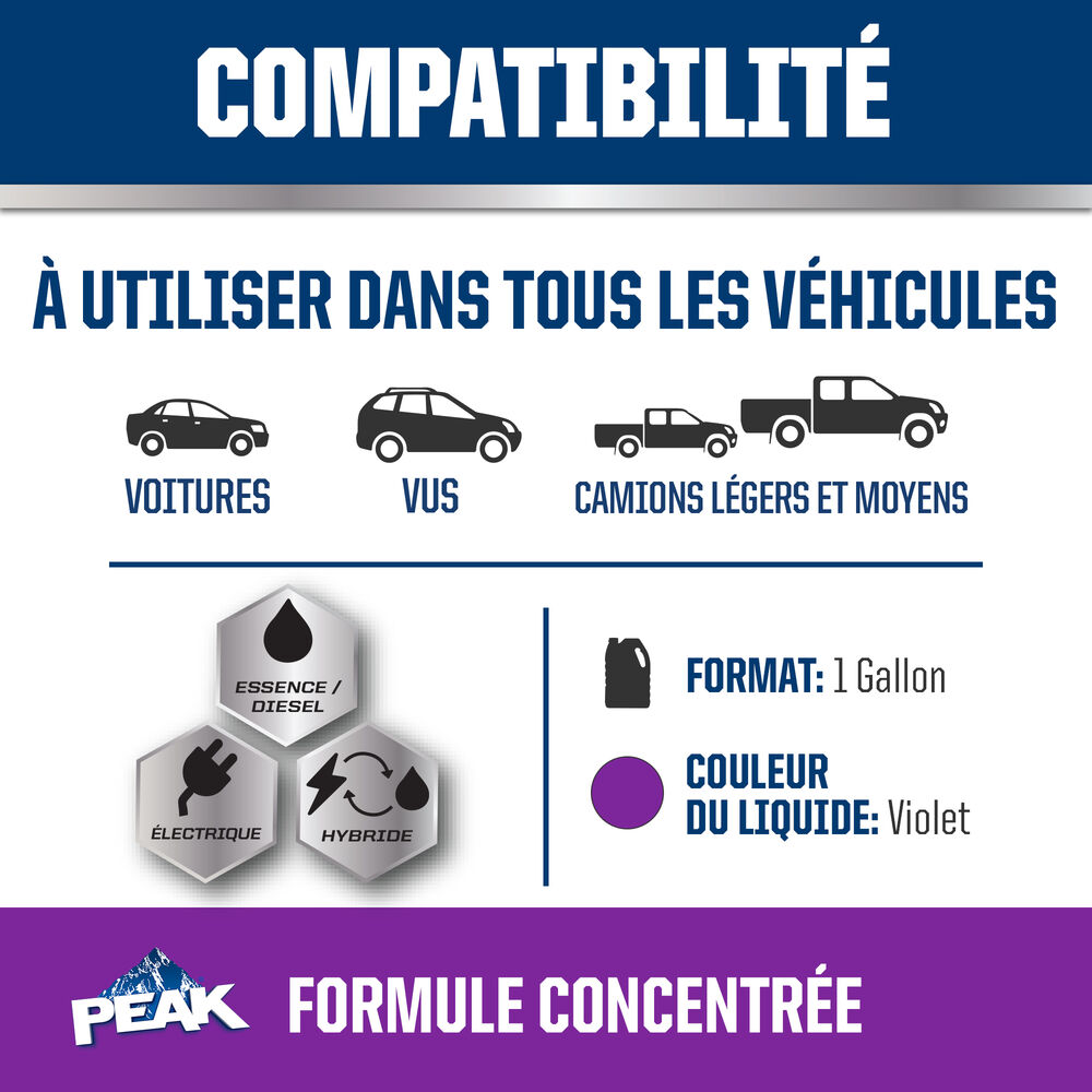 PEAK® À TECHNOLOGIE D’ÉQUIPEMENT D’ORIGINEMC ANTIGEL + LIQUIDE DE REFROIDISSEMENT pour VÉHICULES NORD-AMÉRICAINS - VIOLET est un antigel/liquide de refroidissement à durée de vie prolongée basé sur une technologie d’acide organique (OAT) de pointe. La formule à base d’éthylène glycol représente un mélange soigneusement équilibré d’inhibiteurs de corrosion par acides organiques pour une protection complète des moteurs de véhicules modernes haut rendement Nord-Américains. Il peut être mélangé à n’importe quel liquide de refroidissement à technologie d’acide organique (OAT) de couleur violette dans les véhicules Alfa Romeo, Chrysler, Dodge, Fiat, Jeep et RAM plus récents, ainsi qu’à un antigel/liquide de refroidissement dans les véhicules nécessitant un liquide de refroidissement OAT de couleur violette. La couleur violette de ce produit démontre sa composition chimique unique et garantit une sélection facile pour les véhicules Nord-Américains qui requièrent ce type de technologie et de couleur de liquide de refroidissement.