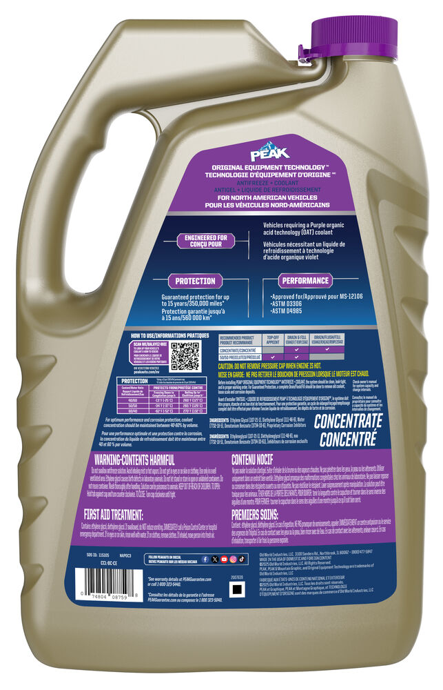 PEAK® À TECHNOLOGIE D’ÉQUIPEMENT D’ORIGINEMC ANTIGEL + LIQUIDE DE REFROIDISSEMENT pour VÉHICULES NORD-AMÉRICAINS - VIOLET répond aux exigences de formule de la technologie des acides organiques (OAT) des équipementiers nord-américains qui nécessitent des formules d’antigel + liquide de refroidissement sans 2-EHA. Répond aux exigences des normes ASTM D3306 et D4985 en matière de rendement ou les dépasse. Offre une protection ultime contre la rouille et la corrosion pour tous les métaux du système de refroidissement. PEAK® garantit une protection allant jusqu’à 15 ans/350 000 milles* (560 000 km) avec un système de rinçage et de remplissage complet du système de refroidissement.* S’il est bien entretenu. Consultez les détails de la garantie à l’adresse PEAKAUTO.com ou composez le 1 800 323-5440.