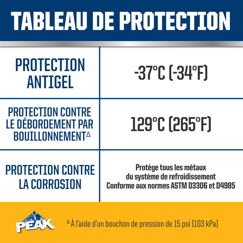 ANTIGEL + LIQUIDE DE REFROIDISSEMENT PEAK ORIGINAL EQUIPMENT TECHNOLOGY pour les véhicules de l’AMÉRIQUE DU NORD – GOLD est exempt de phosphate, d’amines et d’acide éthyl-2 hexanoïque (2-EHA) et est sans danger pour les composants de système de refroidissement non métalliques. Il est entièrement compatible avec d’autres liquides de refroidissement hybrides à base d’or et répond aux exigences de performance des normes ASTM D3306, D4985 et D6210. Avec un rinçage et un remplissage complets, PEAK garantit que ce liquide de refroidissement fournira la durée de vie spécifiée par les fabricants qui utilisent cette technologie spécifique, généralement jusqu’à 5 ans ou 150 000 milles. Utilisez le produit L’ANTIGEL + LIQUIDE DE REFROIDISSEMENT PEAK ORIGINAL EQUIPMENT TECHNOLOGY 50/50 PRÉ-DILUÉ lorsque vous remplissez votre système.
