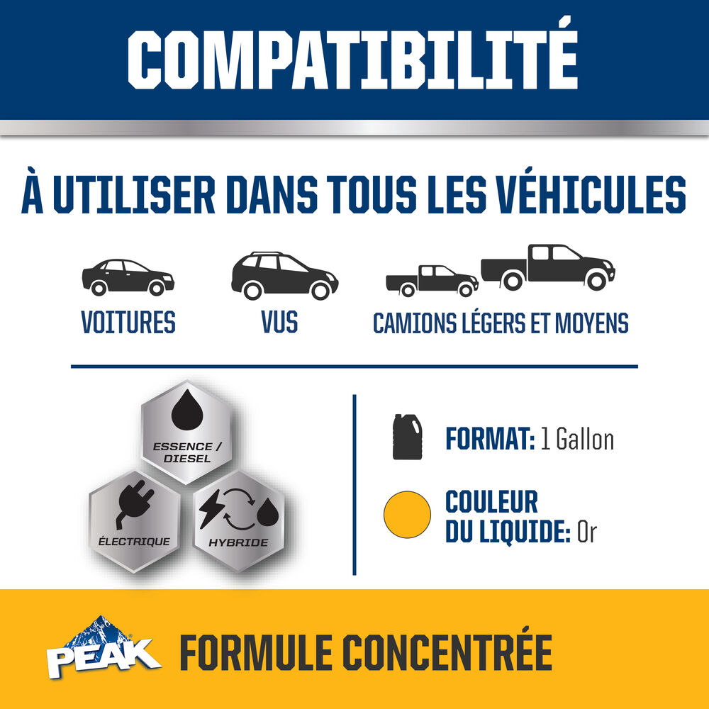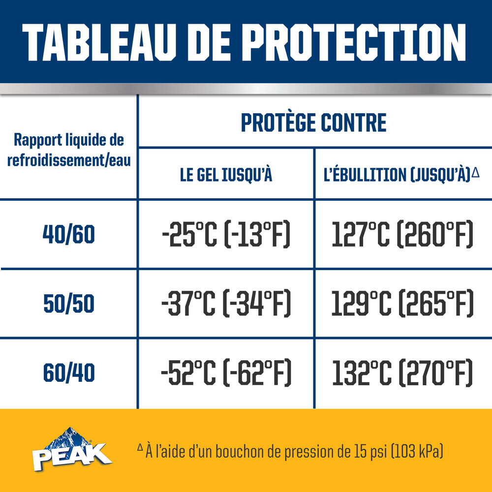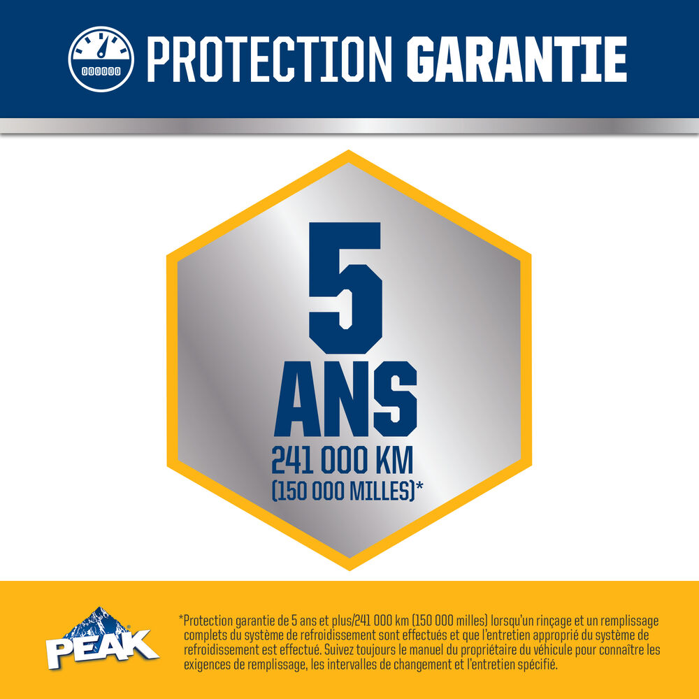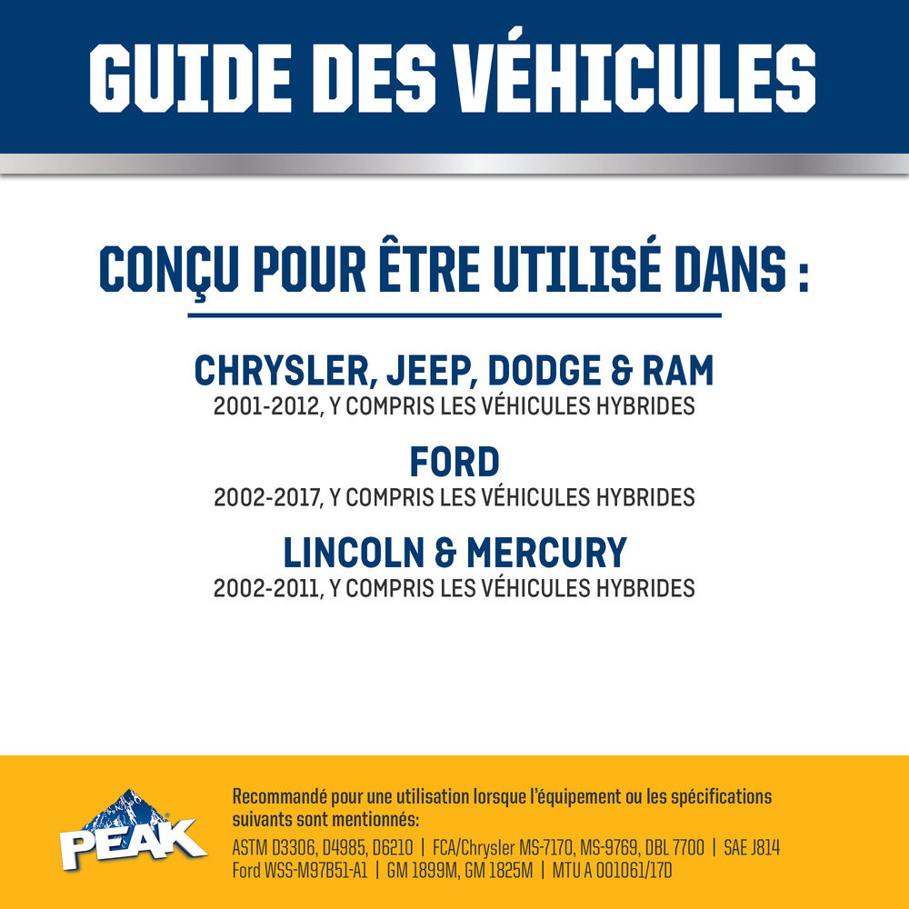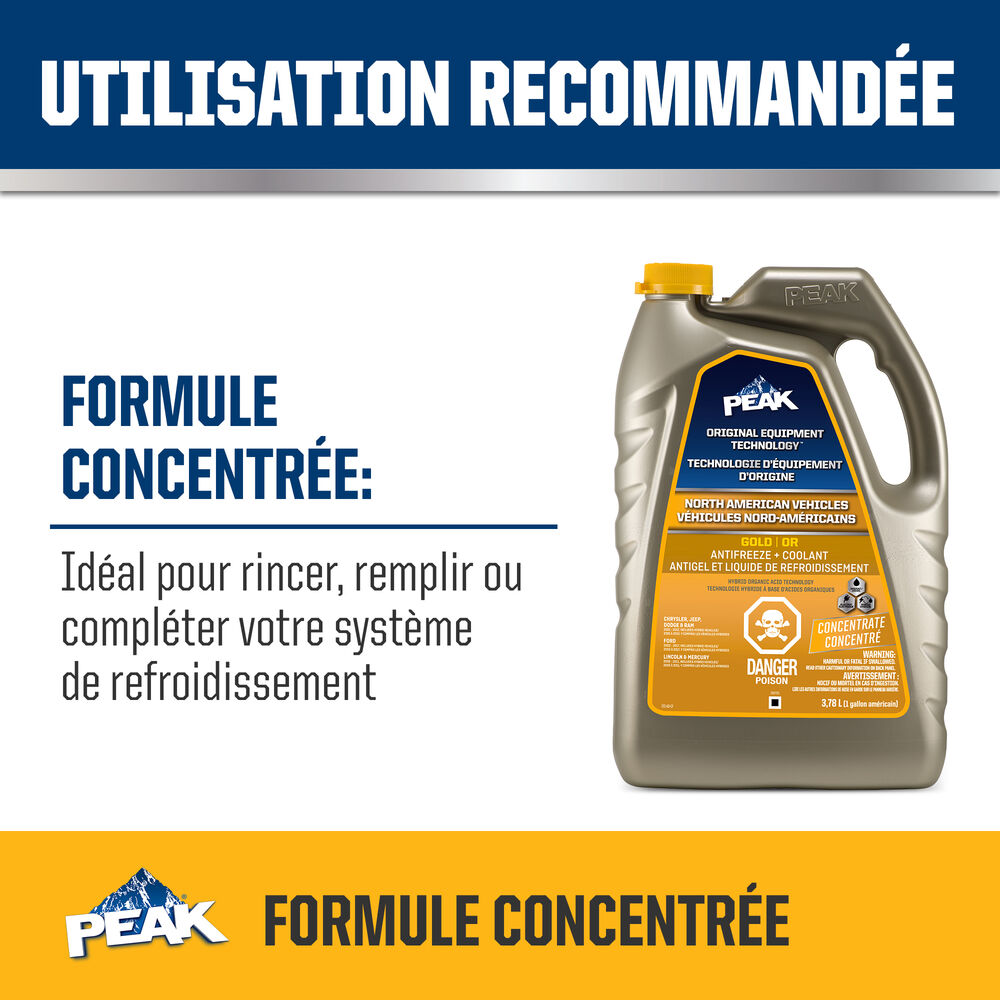 ANTIGEL + LIQUIDE DE REFROIDISSEMENT PEAK ORIGINAL EQUIPMENT TECHNOLOGY pour les véhicules de l’AMÉRIQUE DU NORD – GOLD est exempt de phosphate, d’amines et d’acide éthyl-2 hexanoïque (2-EHA) et est sans danger pour les composants de système de refroidissement non métalliques. Il est entièrement compatible avec d’autres liquides de refroidissement hybrides à base d’or et répond aux exigences de performance des normes ASTM D3306, D4985 et D6210. Avec un rinçage et un remplissage complets, PEAK garantit que ce liquide de refroidissement fournira la durée de vie spécifiée par les fabricants qui utilisent cette technologie spécifique, généralement jusqu’à 5 ans ou 150 000 milles. Utiliser ANTIGEL + LIQUIDE DE REFROIDISSEMENT PEAK ORIGINAL EQUIPMENT TECHNOLOGY pleine puissance (concentré) pour effectuer un rinçage/remplissage complet.