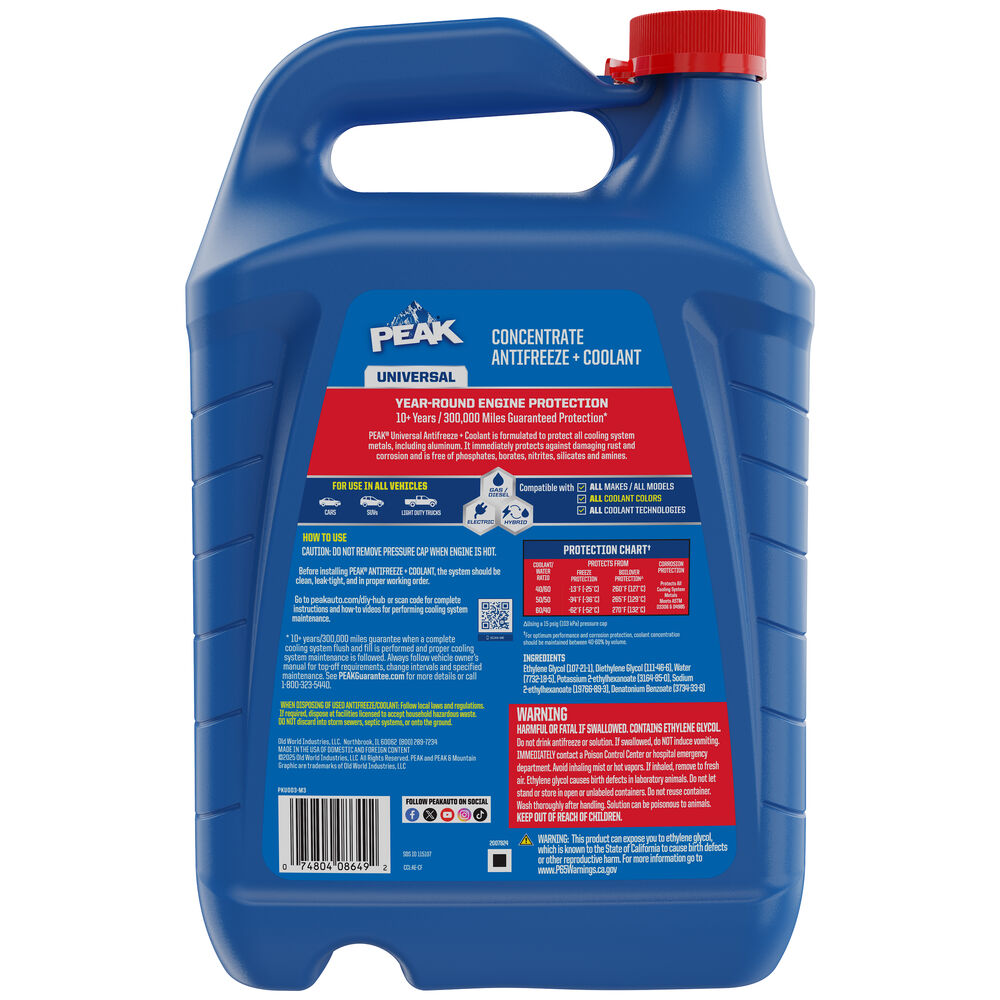 PEAK® Universal Antifreeze + Coolant is formulated to protect all cooling system metals, including aluminum. It immediately protects against damaging rust and corrosion and is free of phosphates, borates, nitrites, silicates and amines.