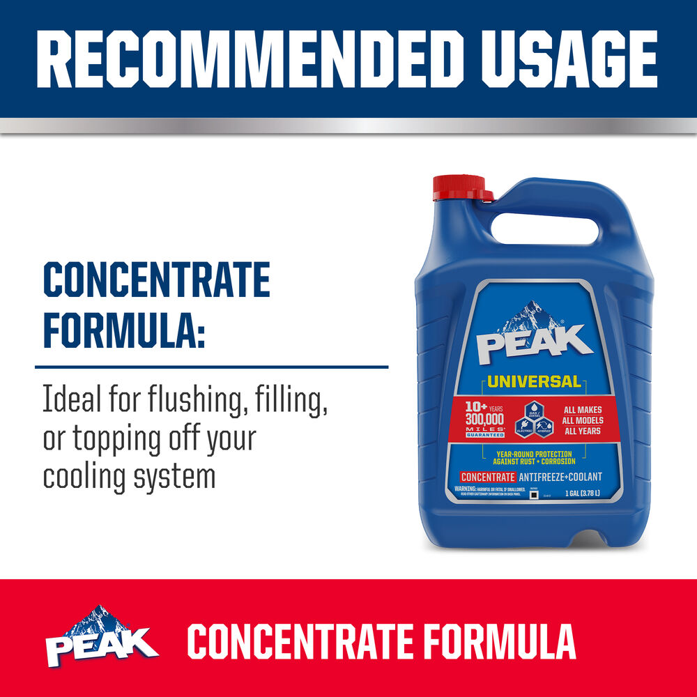 * 10+ years/300,000 miles guarantee when a complete cooling system flush and fill is performed and proper cooling system maintenance is followed. Always follow vehicle owner’s manual for top-off requirements, change intervals and specified maintenance. See PEAKGuarantee.com for more details.