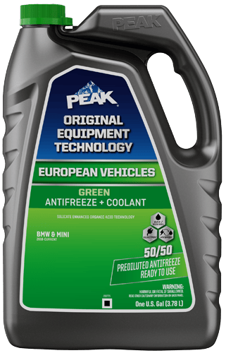 PEAK ORIGINAL EQUIPMENT TECHNOLOGY™ ANTIFREEZE + COOLANT for EUROPEAN VEHICLES is a line of premium coolants specifically designed to match the technology and color requirements of European vehicles. Each coolant is formulated with the same corrosion inhibitor technology that protected your vehicle straight from the factory. These formulas will provide excellent protection against rust and corrosion to all cooling system metals, including aluminum, and are fully compatible with other extended life coolants. Color cues on the packaging and a list of covered vehicles on the front label make it easy to identify the right match for your specific vehicle.