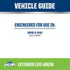 PEAK® ORIGINAL EQUIPMENT TECHNOLOGY™ ANTIFREEZE + COOLANT for EUROPEAN VEHICLES - GREEN meets the performance requirements of ASTM D3306 and BS 6580. With a complete flush and fill, PEAK guarantees this coolant will provide service life protection of up to 150,000 miles or 5 years*.