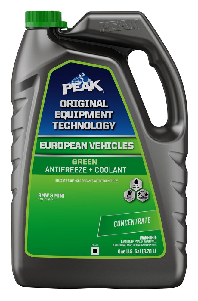 PEAK® ORIGINAL EQUIPMENT TECHNOLOGY™ ANTIFREEZE + COOLANT for EUROPEAN VEHICLES - GREEN is an ethylene glycol-based antifreeze/coolant specifically developed for use in any European vehicle requiring a blue silicate-enhanced hybrid organic acid technology (Si-HOAT) formula. It contains high-quality organic and inorganic corrosion inhibitors and is free of nitrite, phosphate and amines chemicals.