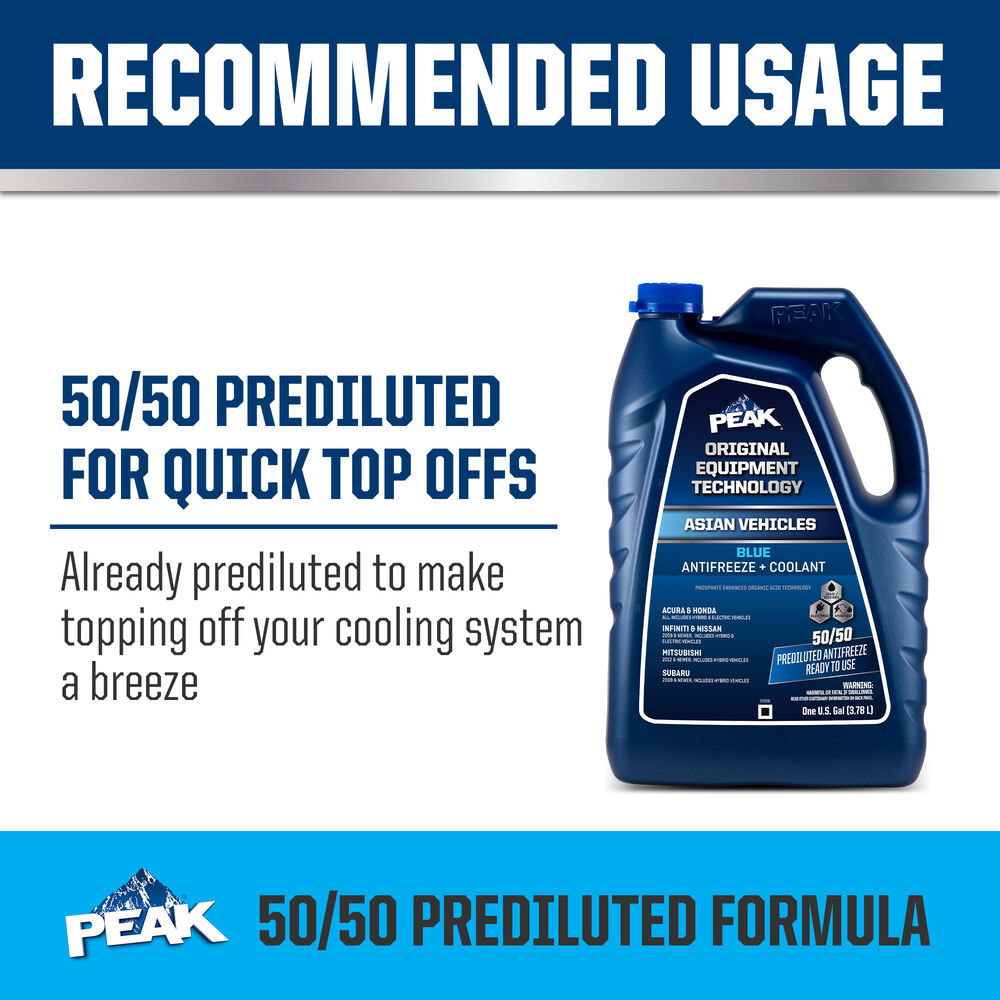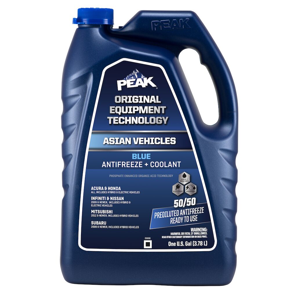 PEAK® ORIGINAL EQUIPMENT TECHNOLOGY™ ANTIFREEZE + COOLANT for ASIAN VEHICLES - BLUE is an ethylene glycol-based antifreeze/coolant specifically developed for use in any Asian vehicle requiring a Blue phosphate-enhanced organic acid technology (POAT) formulation. It contains high-quality organic acid corrosion inhibitors and is free of borate, nitrite, silicate and amines.