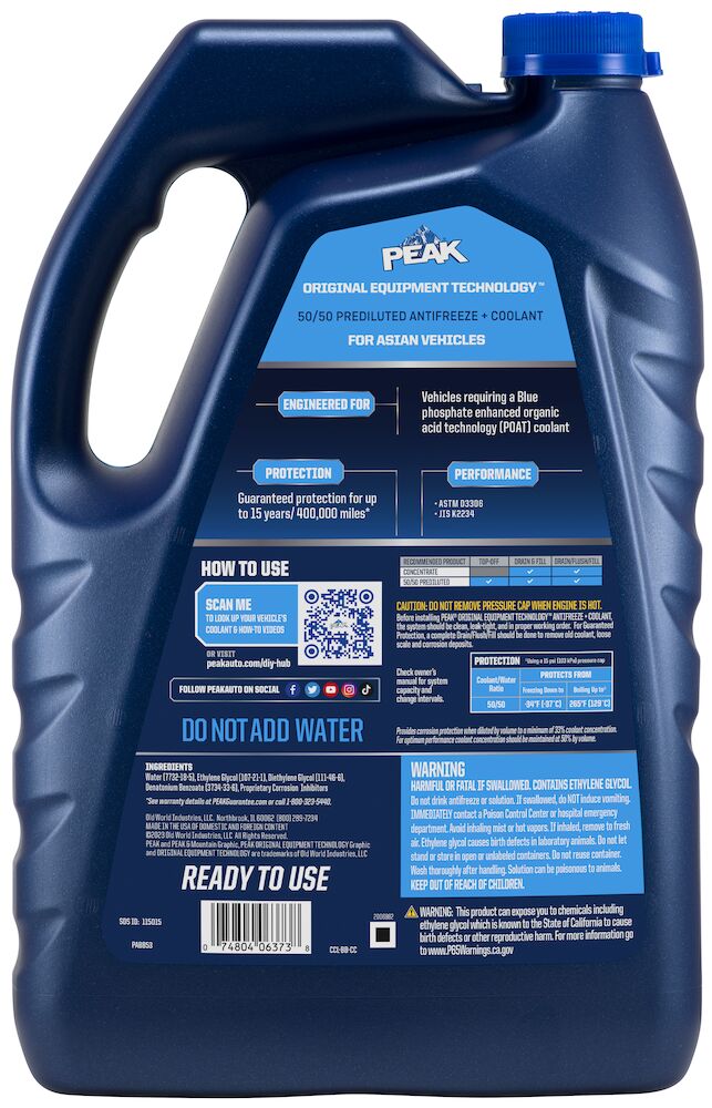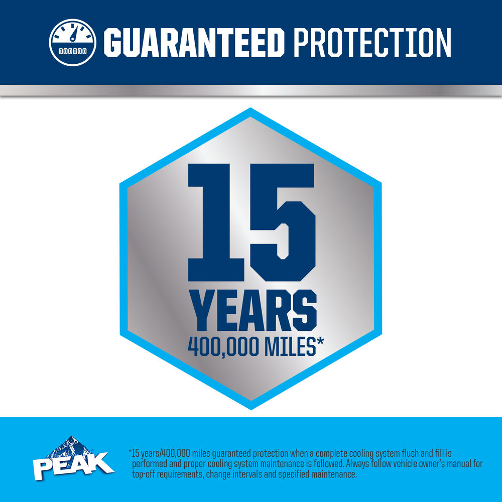 PEAK® ORIGINAL EQUIPMENT TECHNOLOGY™ ANTIFREEZE + COOLANT for ASIAN VEHICLES - BLUE meets the performance requirements of ASTM D3306 and JIS K2234. With a complete flush and fill, PEAK guarantees this coolant will provide service life protection of up to 400,000 miles or 15 years*.