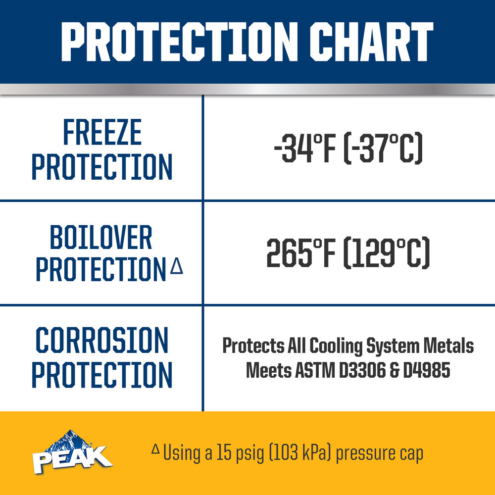 PEAK® ORIGINAL EQUIPMENT TECHNOLOGY™ ANTIFREEZE + COOLANT for NORTH AMERICAN VEHICLES - GOLD is an extended life antifreeze/coolant based on proprietary hybrid organic acid technology (HOAT). The ethylene glycol-based formula combines a mixture of organic acid corrosion inhibitors, stabilized silicate and a nitrite/nitrate combination to provide complete corrosion protection to both gasoline and diesel engines. Its low silicate formula with deposit control additives protects against wet sleeve liner cavitation and scale formation. This product’s gold color distinguishes its unique chemistry and ensures easy selection for Ford and Chrysler vehicles requiring this type of technology and coolant color.
