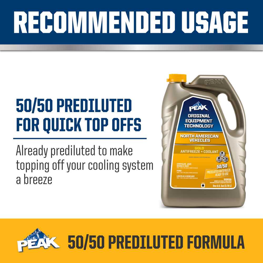 PEAK® ORIGINAL EQUIPMENT TECHNOLOGY™ ANTIFREEZE + COOLANT for NORTH AMERICAN VEHICLES - GOLD is an extended life antifreeze/coolant based on proprietary hybrid organic acid technology (HOAT). The ethylene glycol-based formula combines a mixture of organic acid corrosion inhibitors, stabilized silicate and a nitrite/nitrate combination to provide complete corrosion protection to both gasoline and diesel engines. Its low silicate formula with deposit control additives protects against wet sleeve liner cavitation and scale formation. This product’s gold color distinguishes its unique chemistry and ensures easy selection for Ford and Chrysler vehicles requiring this type of technology and coolant color.