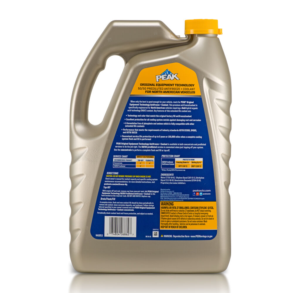 PEAK® ORIGINAL EQUIPMENT TECHNOLOGY™ ANTIFREEZE + COOLANT for NORTH AMERICAN VEHICLES - GOLD is free of phosphate, amines and 2-ethyl hexanoic acid (2-EHA) and is safe for non-metallic cooling system components. It is fully compatible with other gold hybrid coolants and meets the performance requirements of ASTM D3306, D4985 and D6210. With a complete flush and fill, PEAK guarantees this coolant will provide the service life specified by the OEMs utilizing this specific technology, typically up to 5 years or 150,000 miles*.