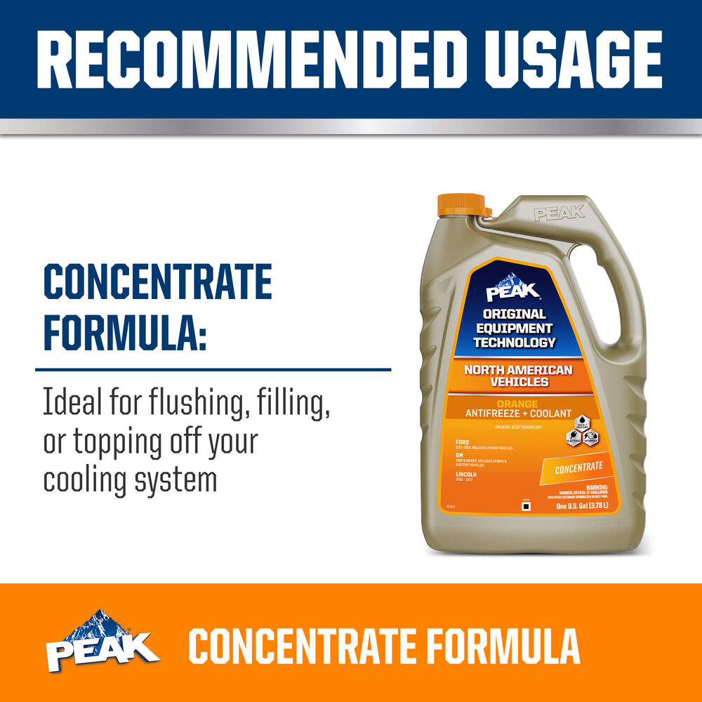 PEAK® ORIGINAL EQUIPMENT TECHNOLOGY™ ANTIFREEZE + COOLANT for NORTH AMERICAN VEHICLES - ORANGE is an extended life antifreeze/coolant based on proprietary state-of-the-art organic acid technology (OAT). The ethylene glycol-based formula represents a carefully balanced mixture of organic acid corrosion inhibitors for complete protection of modern high-performance North American vehicle engines. It can be mixed with any orange colored Organic Acid Technology (OAT) coolant in newer GM, Opel, Daewoo and Saab vehicles, as well as with antifreeze/coolant in Ford and Chrysler vehicles requiring an orange colored OAT coolant. This product’s orange color distinguishes its unique chemistry and ensures easy selection for North American vehicles requiring this type and color of coolant.
