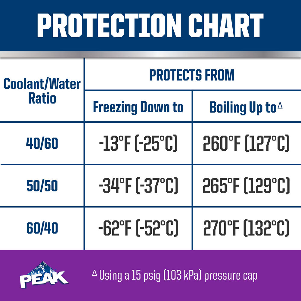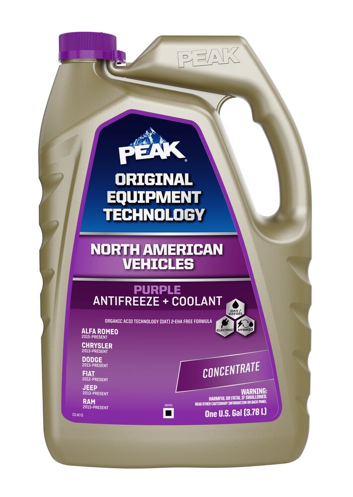 PEAK® ORIGINAL EQUIPMENT TECHNOLOGY™ ANTIFREEZE + COOLANT for NORTH AMERICAN VEHICLES - PURPLE is an extended life antifreeze/coolant based on proprietary state-of-the-art organic acid technology (OAT). The ethylene glycol-based formula represents a carefully balanced mixture of organic acid corrosion inhibitors for complete protection of modern high-performance North American vehicle engines. It can be mixed with any purple colored Organic Acid Technology (OAT) coolant in newer Alfa Romeo, Chrysler, Dodge, Fiat, Jeep, and RAM vehicles, as well as with antifreeze/coolant in vehicles requiring a purple colored OAT coolant. This product’s purple color distinguishes its unique chemistry and ensures easy selection for North American vehicles requiring this type and color of coolant.