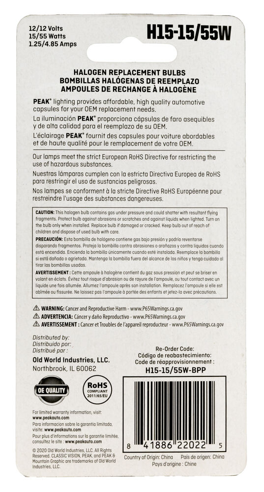 PEAK Halogen Bulbs Automotive Headlamp H15-15/55W