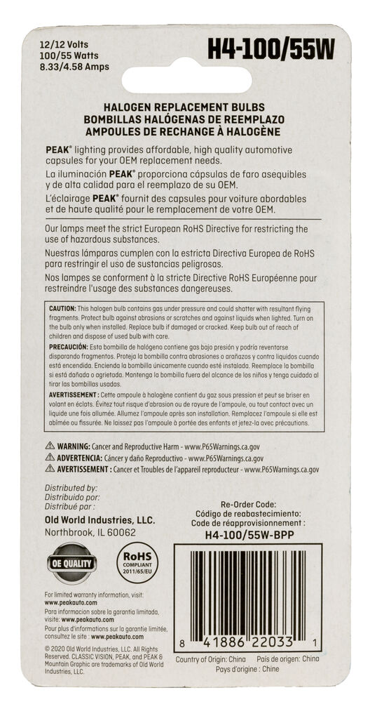 PEAK Halogen Bulbs Automotive Headlamp H4-100/55W