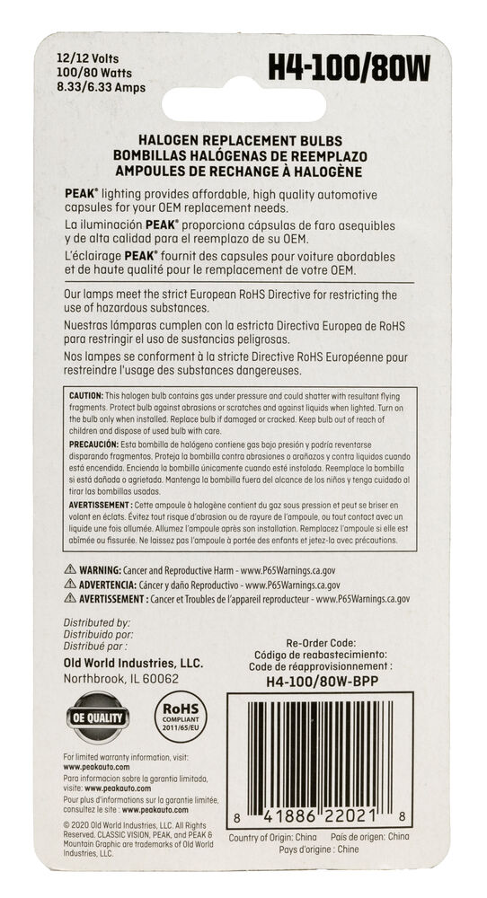 PEAK Halogen Bulbs Automotive Headlamp H4-100/80W