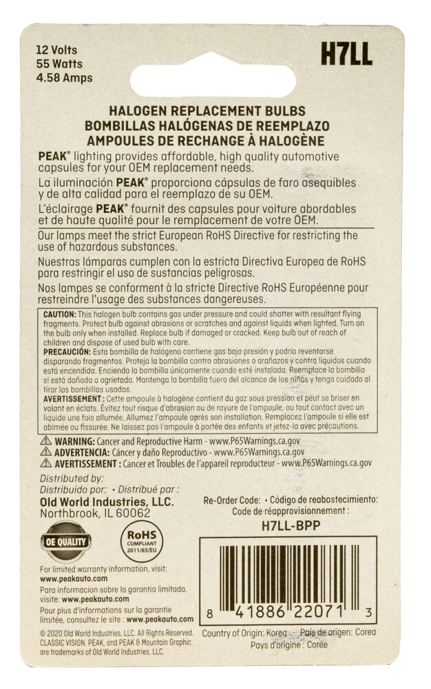 PEAK Halogen Bulbs Long Life Automotive Headlamp H7