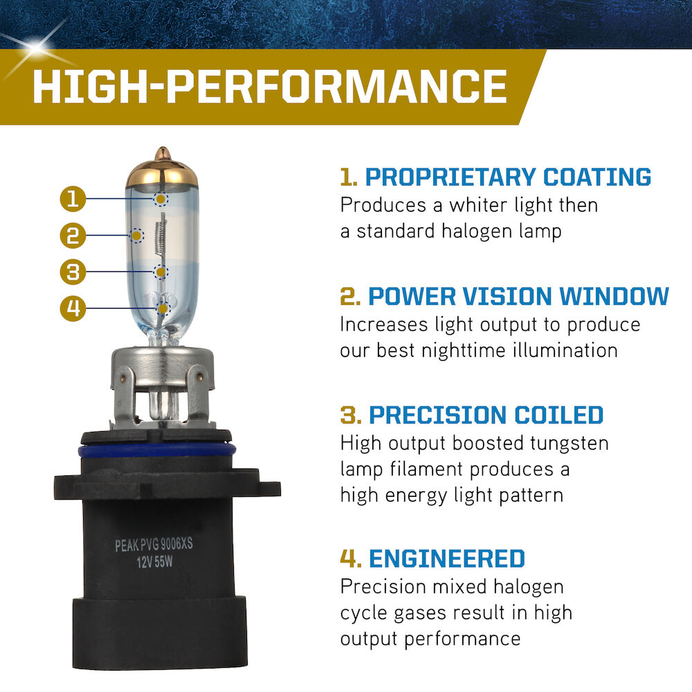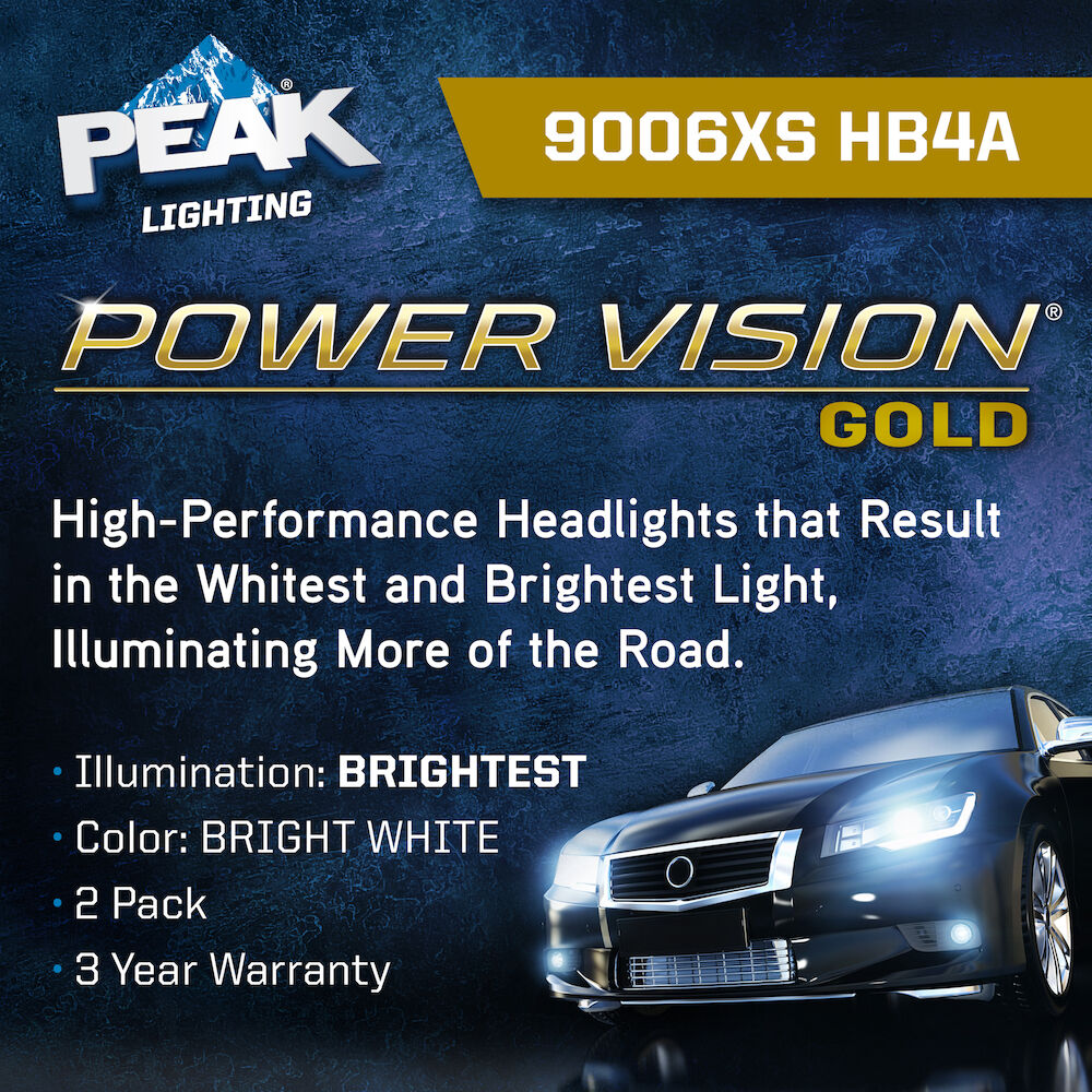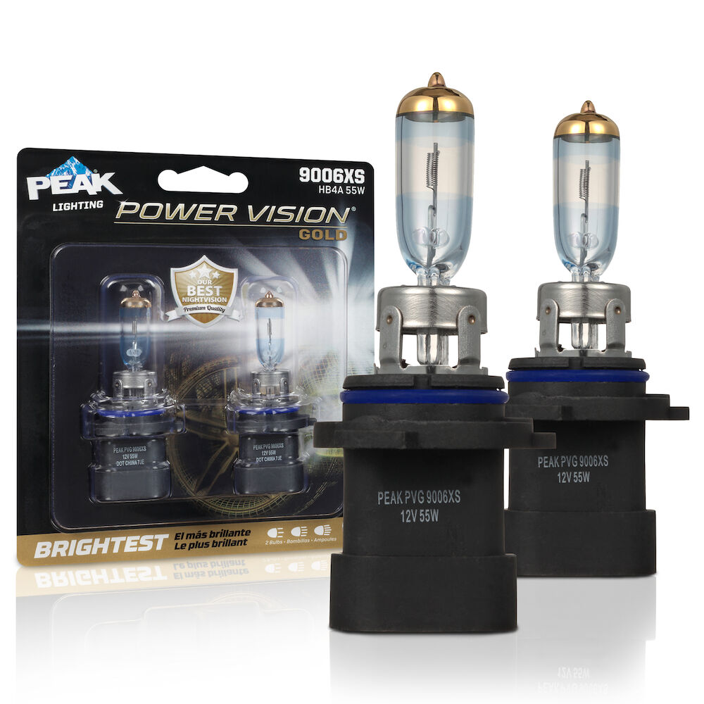 The PEAK Power Vision Gold Headlamps feature high-performance tungsten filaments and customized gas mixtures, combined with a proprietary optical coating. Safe driving at night is critical, and it starts with your headlights. The sooner you’re able to see an object on the road the quicker you can react. Make sure your headlights are performing correctly and be sure to replace them with a high-performance headlights for increased visibility.
