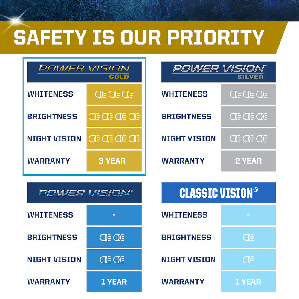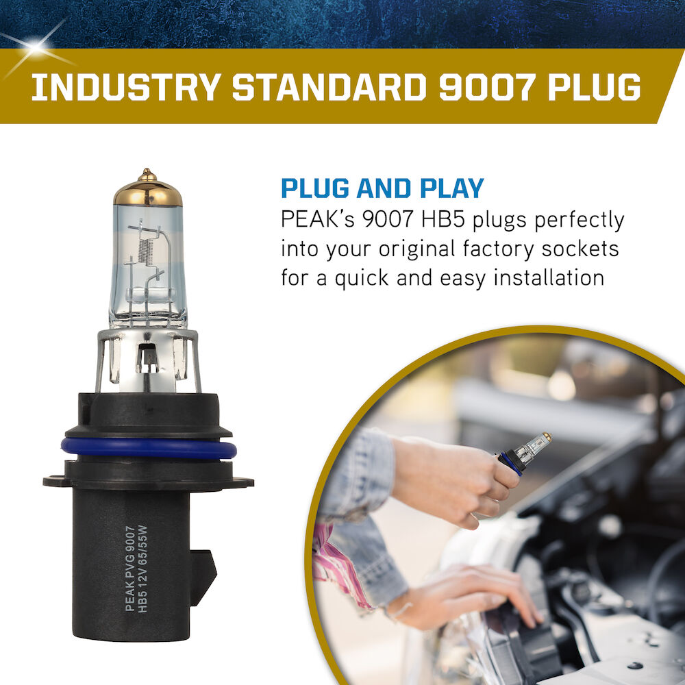 The PEAK Power Vision Gold Headlights feature high-performance tungsten filaments and customized gas mixtures, combined with a proprietary optical coating. Safe driving at night is critical, and it starts with your headlights. The sooner you’re able to see an object on the road the quicker you can react. Make sure your headlights are performing correctly and be sure to replace them with a high-performance headlights for increased visibility.