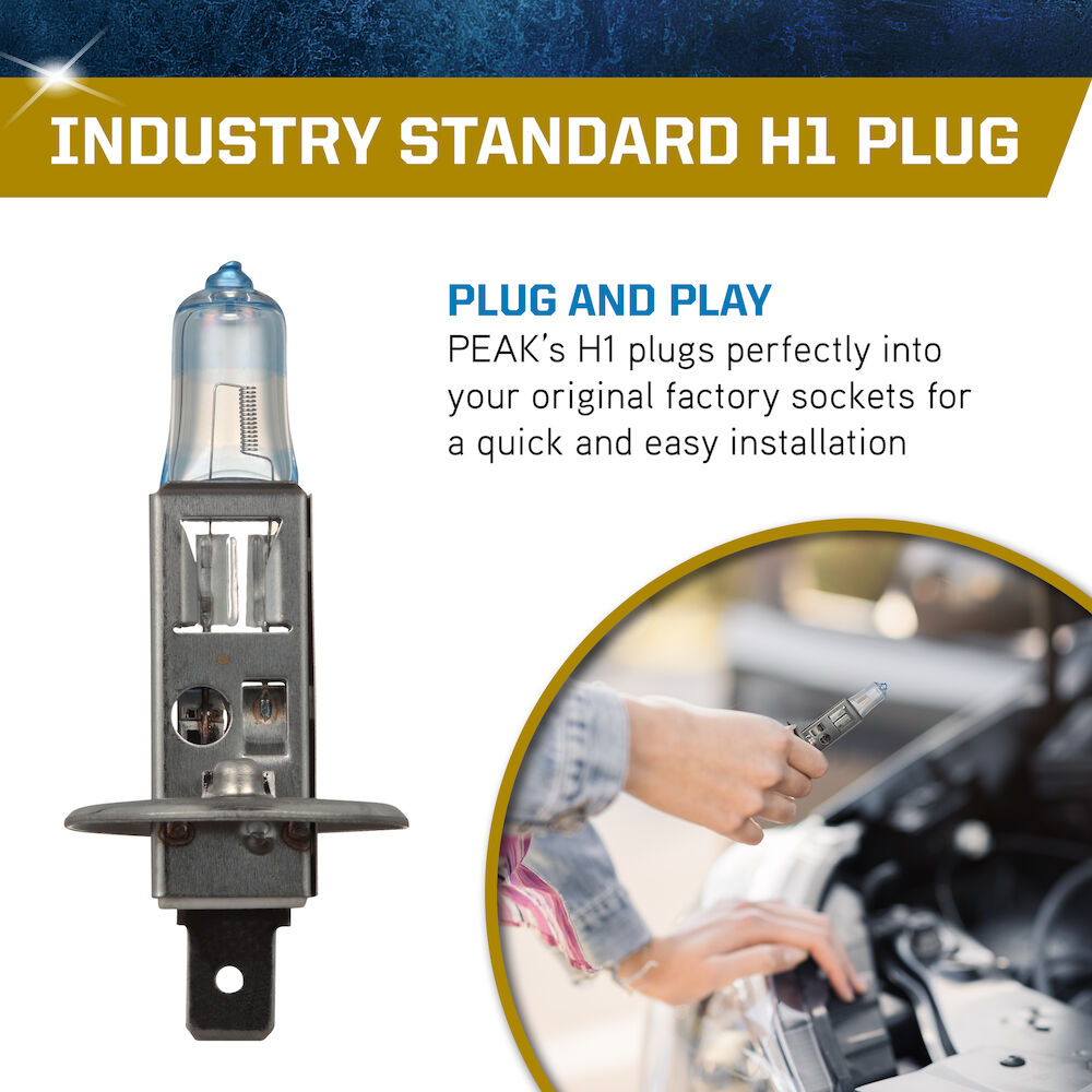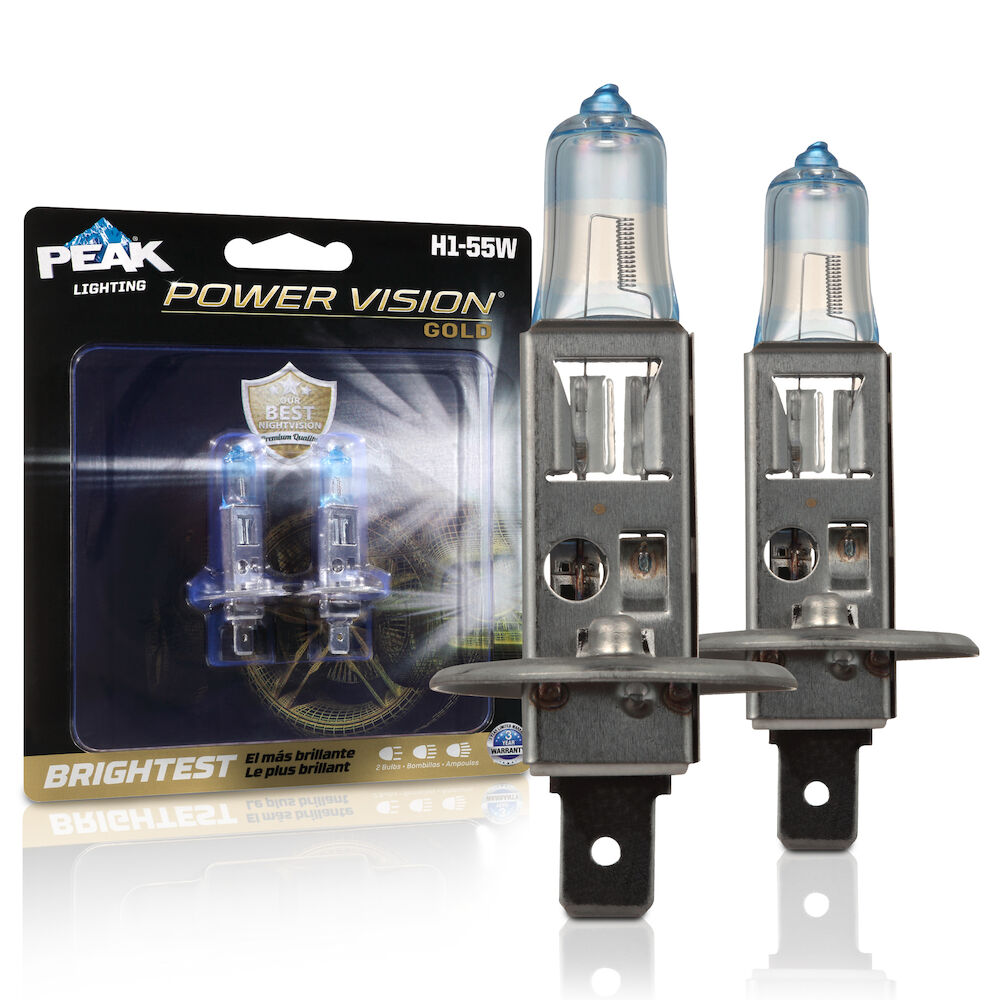 Upgrade your vehicle and make driving safer with the PEAK Power Vision Gold Automotive High Output Performance H1 55W Headlights. These tungsten filament headlights provide a direct fit replacement for your factory headlights and produce the brightest down road and side road vision for your vehicle. Our proprietary coating produces a whiter light, and combined with our Power Vision Window, provides a more defined view of the road, producing our best nighttime illumination yet. These 55W headlights are compatible with all vehicles and headlamp configurations that accept H1 bulbs, providing an easy and direct fit for several cars, trucks, vans, and SUVs. The PEAK Power Vision Gold Automotive High Output Performance H1 55W Headlights are also available in Standard and Silver output levels. PEAK’s parent company, Old World Industries, is an independent, family-owned business that has been a leader in the development and distribution of high-quality automotive products for over four decades. The PEAK brand has always been a little different – and always about the customers that are passionate about life and their vehicles. Over four decades of American ingenuity in developing world-class products that meet or exceed industry performance and quality standards. PEAK exists to deliver peak performance, so our customers get more out of their vehicles…and more out of life.