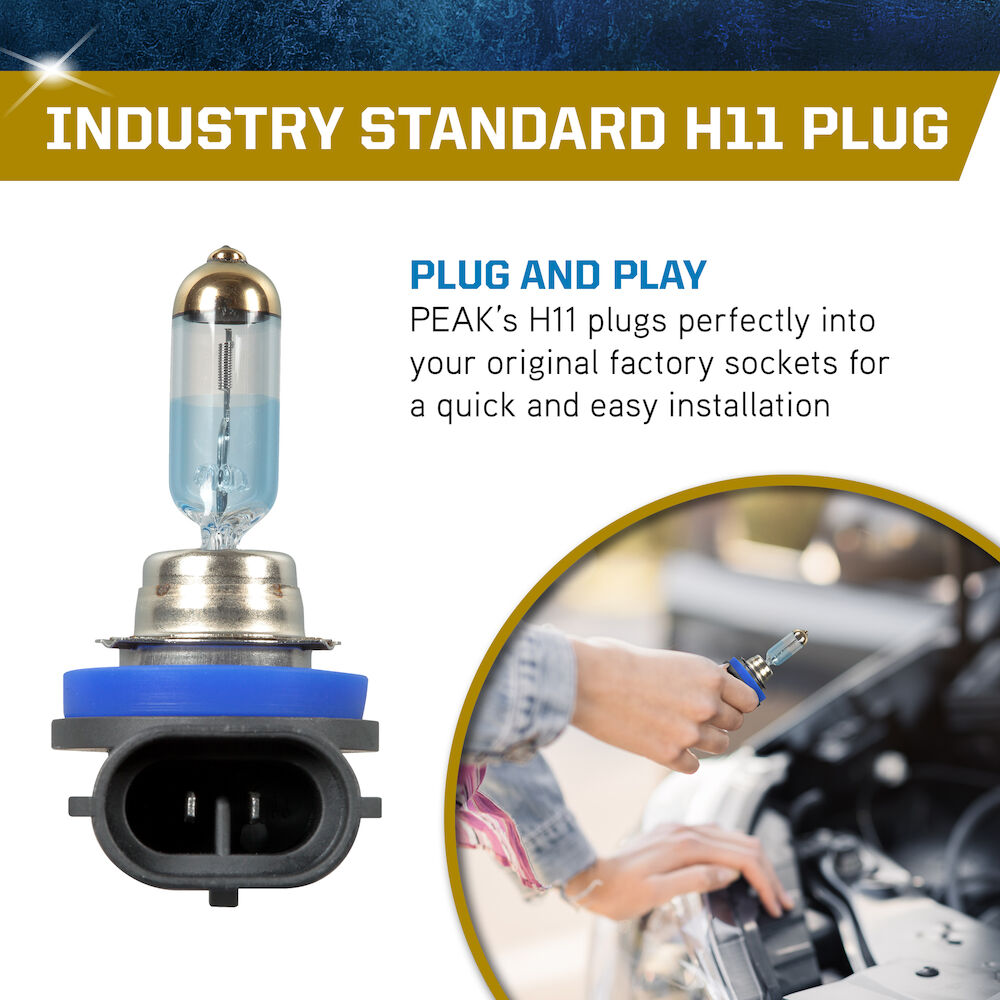 Upgrade your vehicle and make driving safer with the PEAK Power Vision Gold Automotive High Output Performance H11 55W Headlights. These tungsten filament headlights provide a direct fit replacement for your factory headlights and produce the brightest down road and side road vision for your vehicle. Our proprietary coating produces a whiter light, and combined with our Power Vision Window, provides a more defined view of the road, producing our best nighttime illumination yet. These 55W headlights are compatible with all vehicles and headlamp configurations that accept H11 bulbs, providing an easy and direct fit for several cars, trucks, vans, and SUVs. The PEAK Power Vision Gold Automotive High Output Performance H11 55W Headlights are also available in Standard and Silver output levels. PEAK’s parent company, Old World Industries, is an independent, family-owned business that has been a leader in the development and distribution of high-quality automotive products for over four decades. The PEAK brand has always been a little different – and always about the customers that are passionate about life and their vehicles. Over four decades of American ingenuity in developing world-class products that meet or exceed industry performance and quality standards. PEAK exists to deliver peak performance, so our customers get more out of their vehicles…and more out of life.