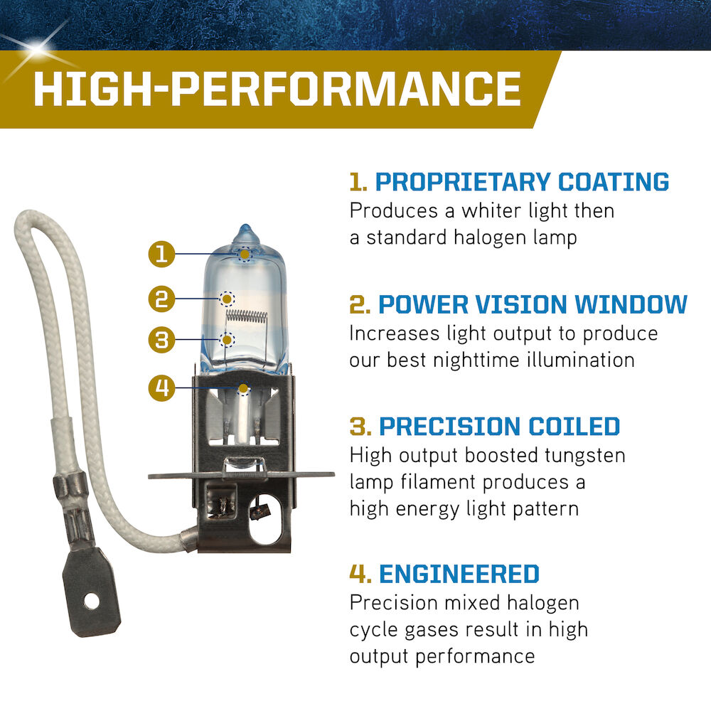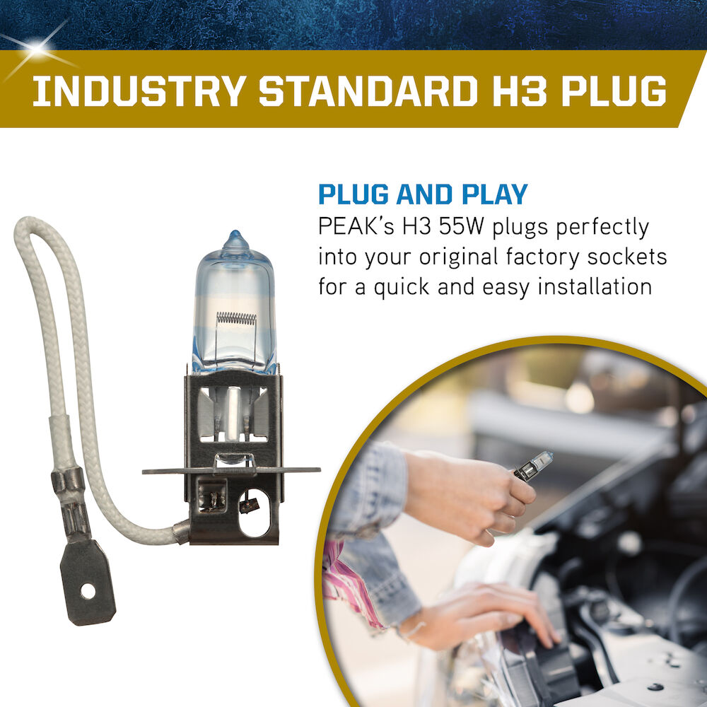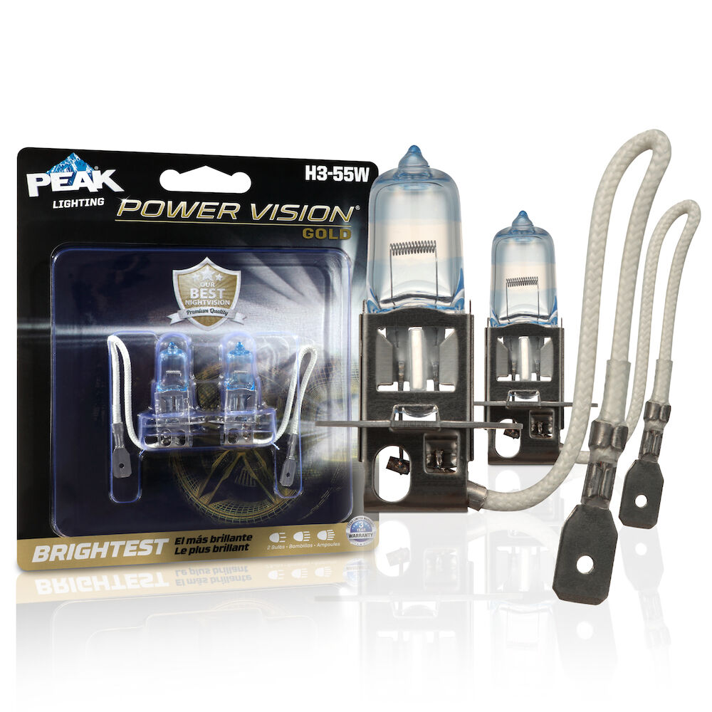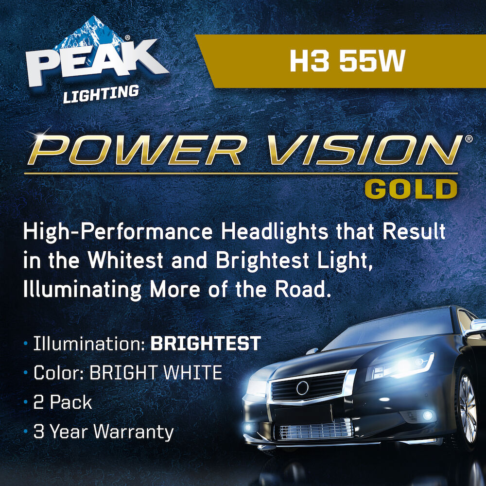 Upgrade your vehicle and make driving safer with the PEAK Power Vision Gold Automotive High Output Performance H3 55W Headlights. These tungsten filament headlights provide a direct fit replacement for your factory headlights and produce the brightest down road and side road vision for your vehicle. Our proprietary coating produces a whiter light, and combined with our Power Vision Window, provides a more defined view of the road, producing our best nighttime illumination yet. These 55W headlights are compatible with all vehicles and headlamp configurations that accept H3 bulbs, providing an easy and direct fit for several cars, trucks, vans, and SUVs. The PEAK Power Vision Gold Automotive High Output Performance H3 55W Headlights are also available in Standard and Silver output levels. PEAK’s parent company, Old World Industries, is an independent, family-owned business that has been a leader in the development and distribution of high-quality automotive products for over four decades. The PEAK brand has always been a little different – and always about the customers that are passionate about life and their vehicles. Over four decades of American ingenuity in developing world-class products that meet or exceed industry performance and quality standards. PEAK exists to deliver peak performance, so our customers get more out of their vehicles…and more out of life.