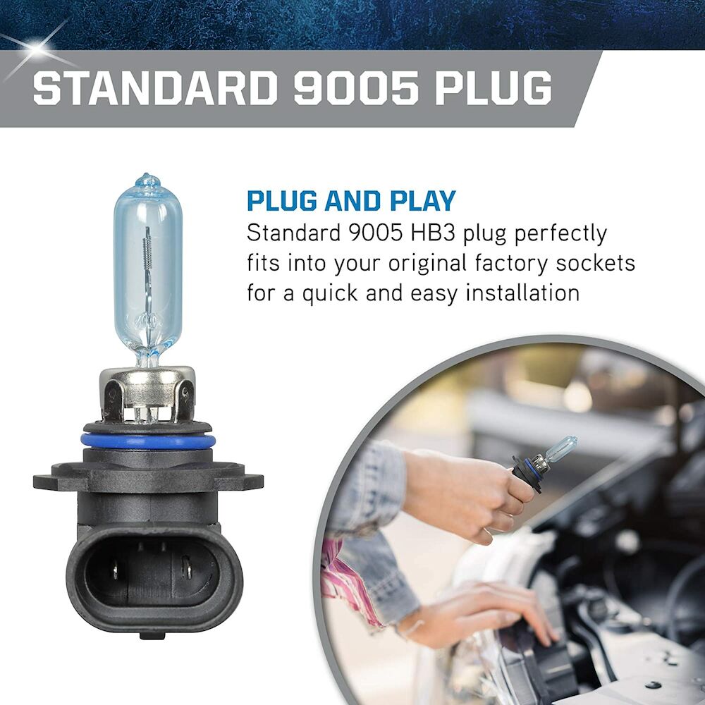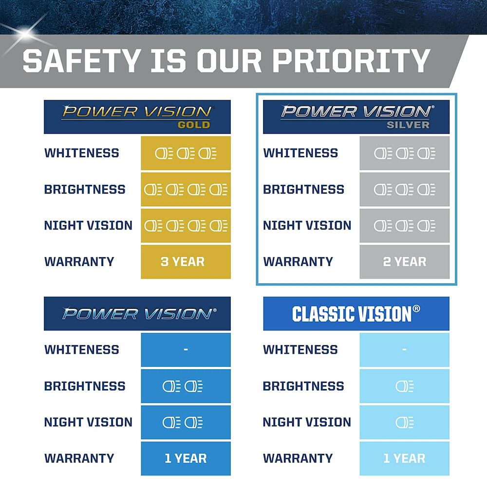 The Power Vision Silver Halogen Headlights feature a boosted tungsten filaments, customized gas mixtures, and our proprietary coating to produce a whiter and brighter light. Safe driving at night is essential, and it starts with your headlights. The sooner you’re able to see an object on the road the quicker you can react. Make sure your headlights are performing correctly and be sure to replace them with a high-performance headlights for increased visibility.