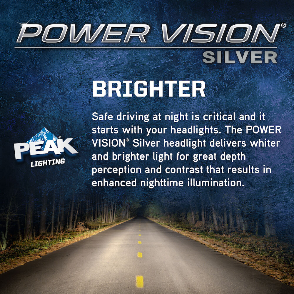 The Power Vision Silver Halogen Headlights feature a boosted tungsten filaments, customized gas mixtures, and our proprietary coating to produce a whiter and brighter light. Safe driving at night is essential, and it starts with your headlights. The sooner you’re able to see an object on the road the quicker you can react. Make sure your headlights are performing correctly and be sure to replace them with a high-performance headlights for increased visibility.