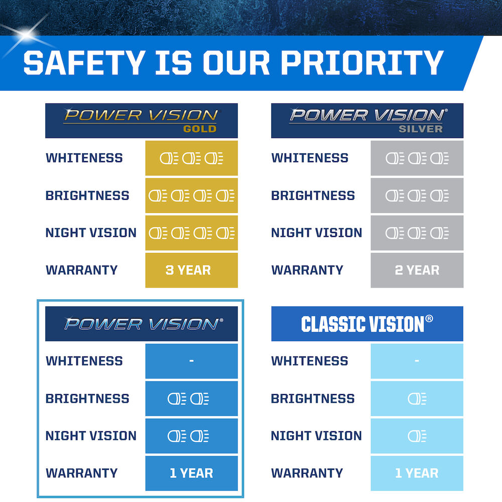 The Power Vision Halogen Headlights feature boosted tungsten filaments which produces a brighter light. Safe driving at night is essential, and it starts with your headlights. The sooner you’re able to see an object on the road the quicker you can react. Make sure your headlights are performing correctly and be sure to replace them with a high-performance headlight for increased visibility.