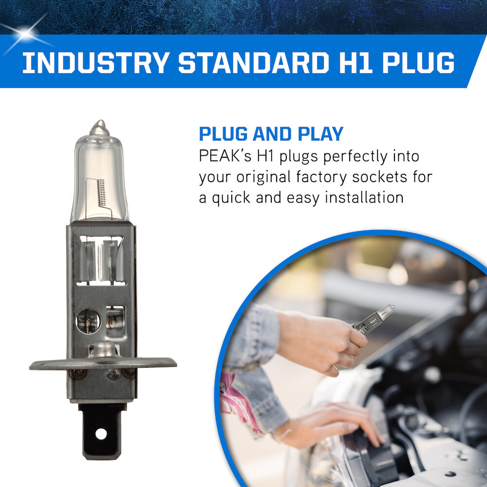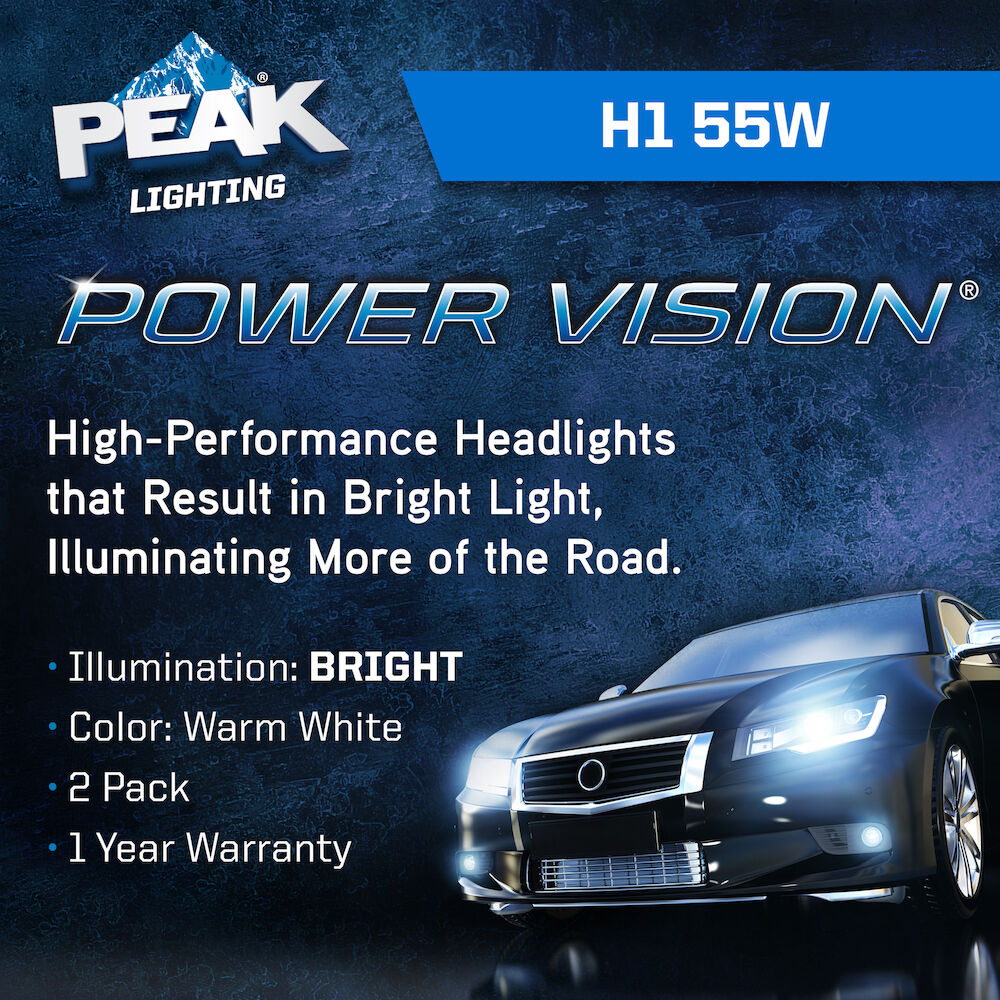 Upgrade your vehicle and make driving safer with the PEAK Power Vision Automotive High Performance H1 55W Headlights. These tungsten filament headlights provide a direct fit replacement for your factory headlights and produce a whiter light than standard halogen headlamps. The lights' mixed halogen cycle gases and precision-coiled filament produce a high output that increases visibility while driving at night to help you drive safer. These 55W headlights are compatible with all vehicles and headlamp configurations that accept H1 bulbs, providing an easy and direct fit for several cars, trucks, vans, and SUVs. The PEAK Power Vision Automotive High Output Performance H1 55W Headlights are also available in Silver and Gold output levels. PEAK’s parent company, Old World Industries, is an independent, family-owned business that has been a leader in the development and distribution of high-quality automotive products for over four decades. The PEAK brand has always been a little different – and always about the customers that are passionate about life and their vehicles. Over four decades of American ingenuity in developing world-class products that meet or exceed industry performance and quality standards. PEAK exists to deliver peak performance, so our customers get more out of their vehicles…and more out of life.