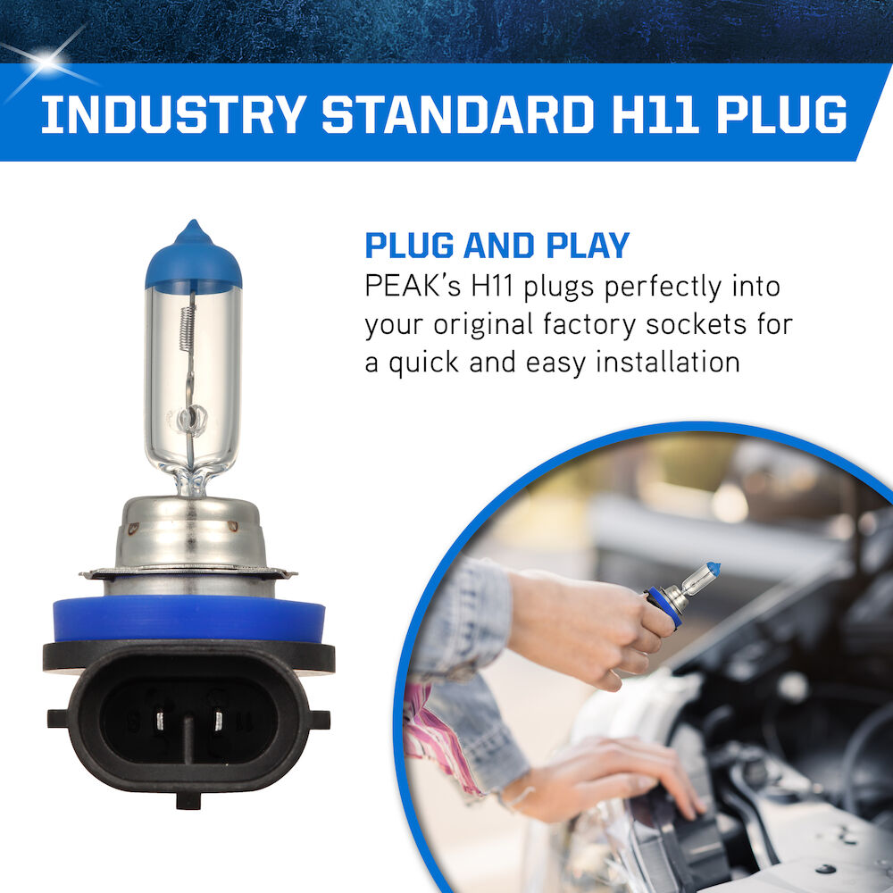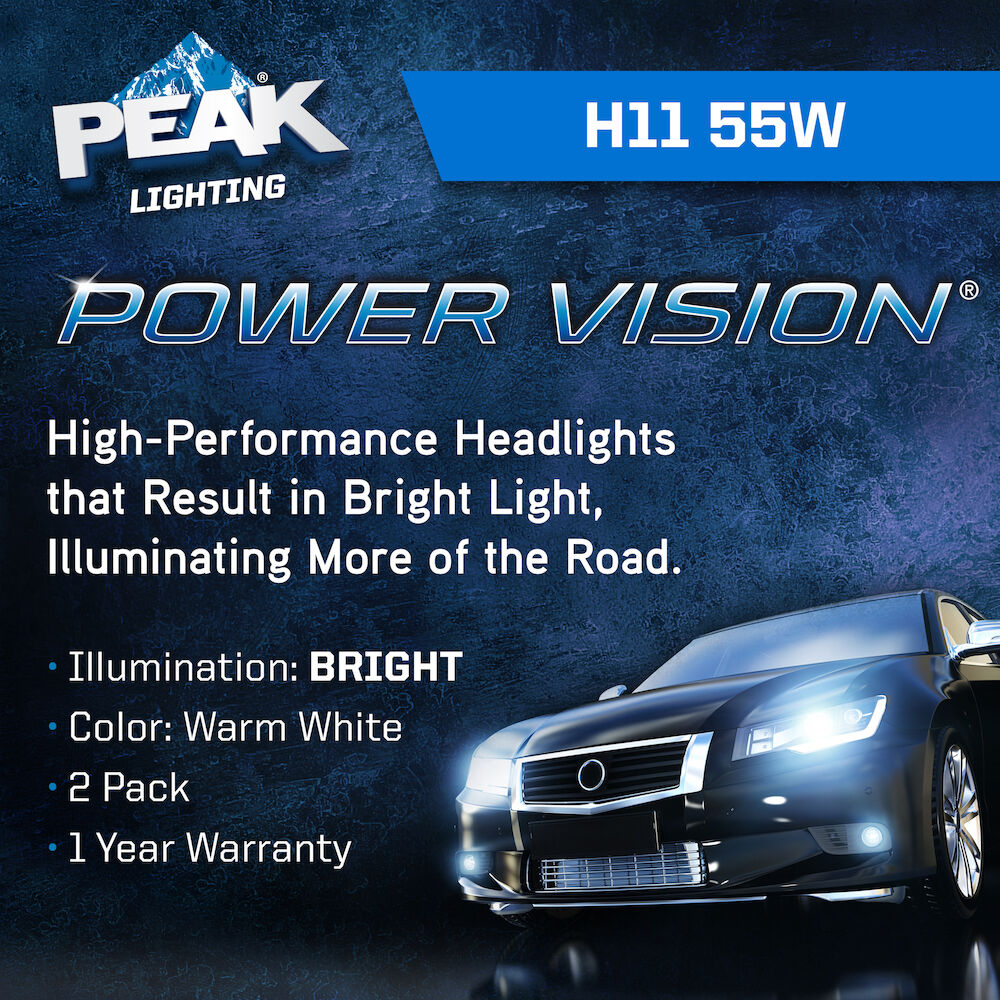Upgrade your vehicle and make driving safer with the PEAK Power Vision Automotive High Performance H11 55W Headlights. These tungsten filament headlights provide a direct fit replacement for your factory headlights and produce a whiter light than standard halogen headlamps. The lights' mixed halogen cycle gases and precision-coiled filament produce a high output that increases visibility while driving at night to help you drive safer. These 55W headlights are compatible with all vehicles and headlamp configurations that accept H11 bulbs, providing an easy and direct fit for several cars, trucks, vans, and SUVs. The PEAK Power Vision Automotive High Output Performance H11 55W Headlights are also available in Silver and Gold output levels. PEAK’s parent company, Old World Industries, is an independent, family-owned business that has been a leader in the development and distribution of high-quality automotive products for over four decades. The PEAK brand has always been a little different – and always about the customers that are passionate about life and their vehicles. Over four decades of American ingenuity in developing world-class products that meet or exceed industry performance and quality standards. PEAK exists to deliver peak performance, so our customers get more out of their vehicles…and more out of life.