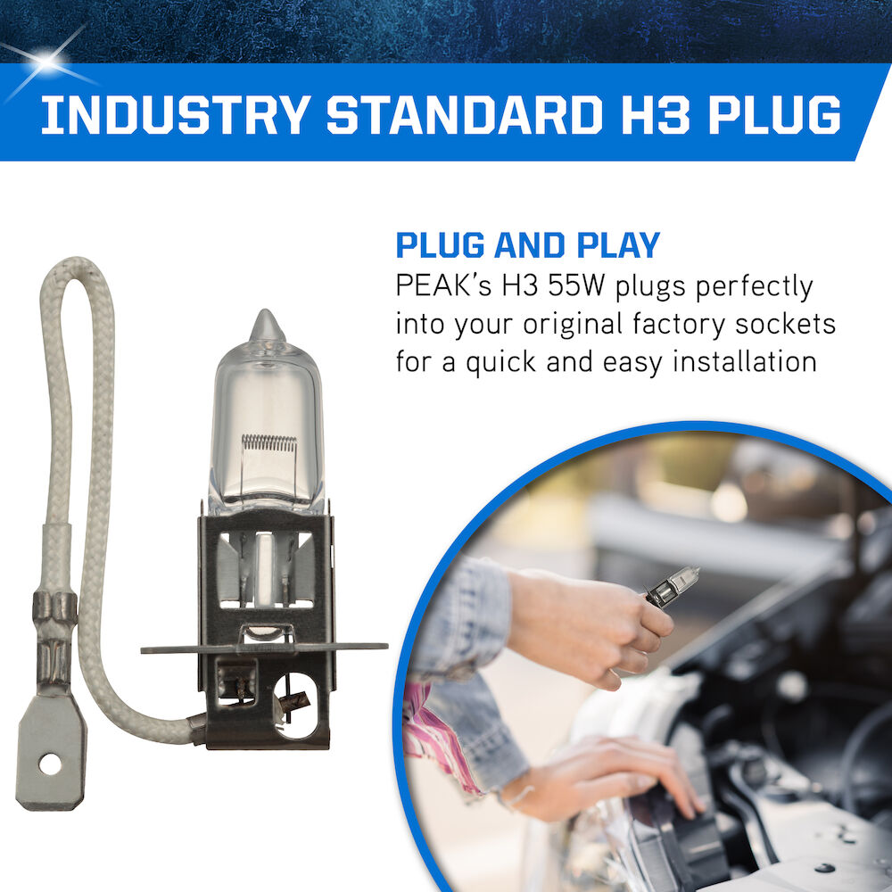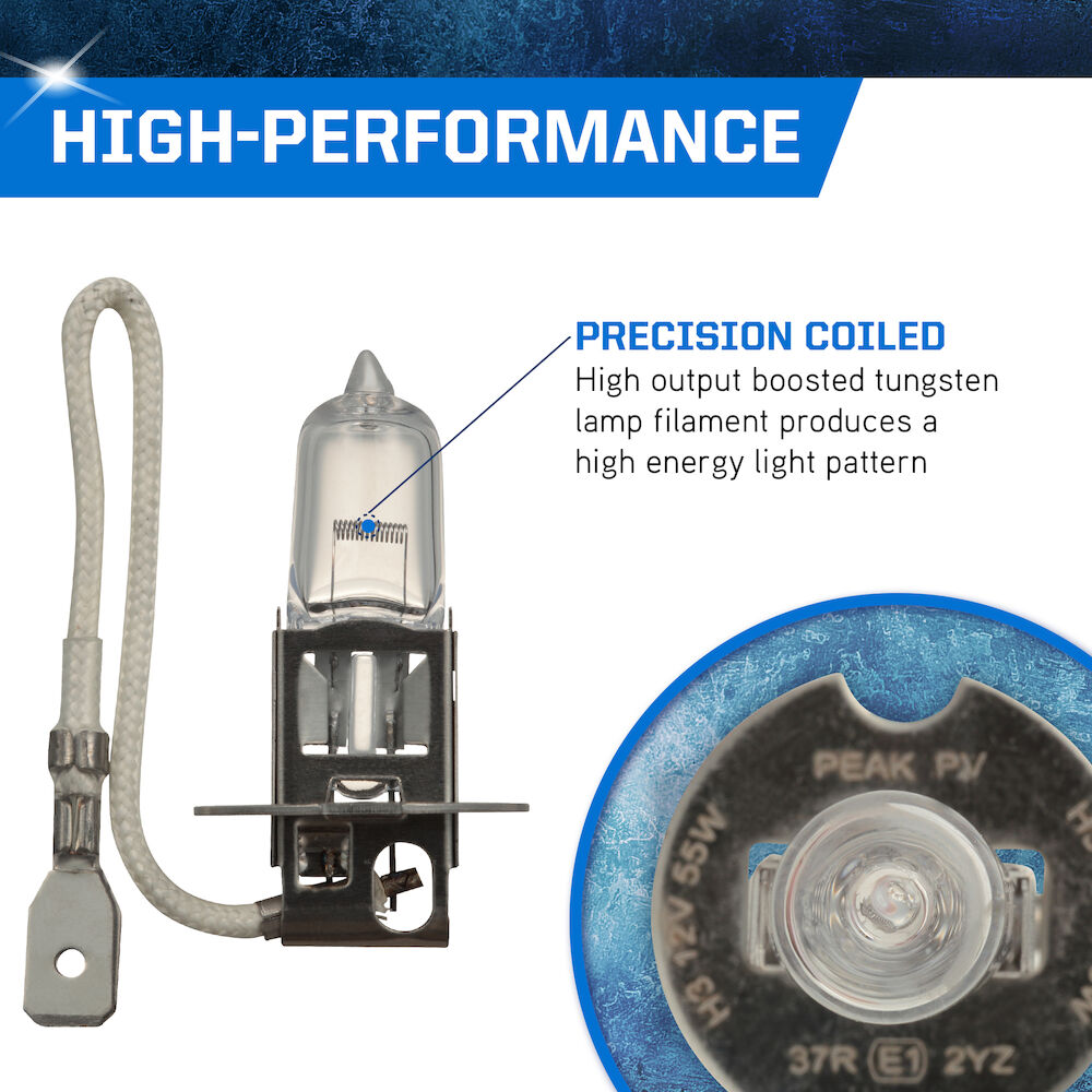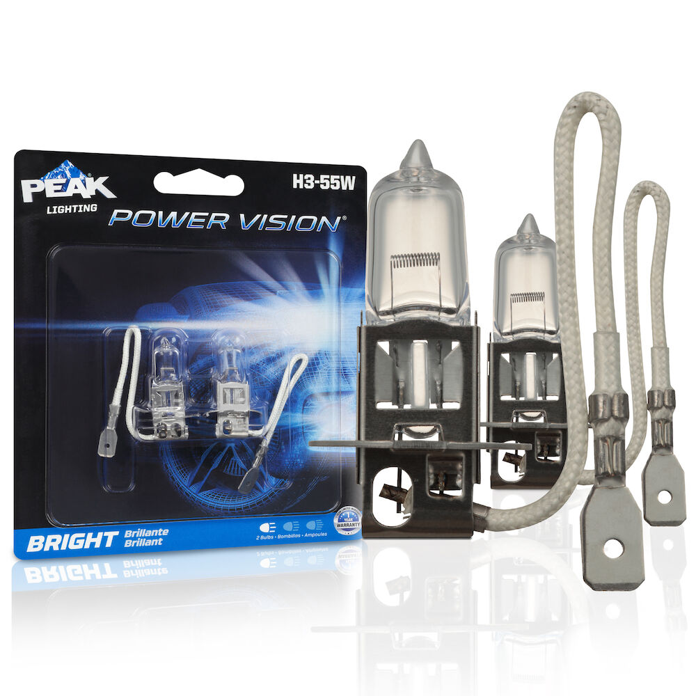 Upgrade your vehicle and make driving safer with the PEAK Power Vision Automotive High Performance H3 55W Headlights. These tungsten filament headlights provide a direct fit replacement for your factory headlights and produce a whiter light than standard halogen headlamps. The lights' mixed halogen cycle gases and precision-coiled filament produce a high output that increases visibility while driving at night to help you drive safer. These 55W headlights are compatible with all vehicles and headlamp configurations that accept H3 bulbs, providing an easy and direct fit for several cars, trucks, vans, and SUVs. The PEAK Power Vision Automotive High Output Performance H3 55W Headlights are also available in Silver and Gold output levels. PEAK’s parent company, Old World Industries, is an independent, family-owned business that has been a leader in the development and distribution of high-quality automotive products for over four decades. The PEAK brand has always been a little different – and always about the customers that are passionate about life and their vehicles. Over four decades of American ingenuity in developing world-class products that meet or exceed industry performance and quality standards. PEAK exists to deliver peak performance, so our customers get more out of their vehicles…and more out of life.