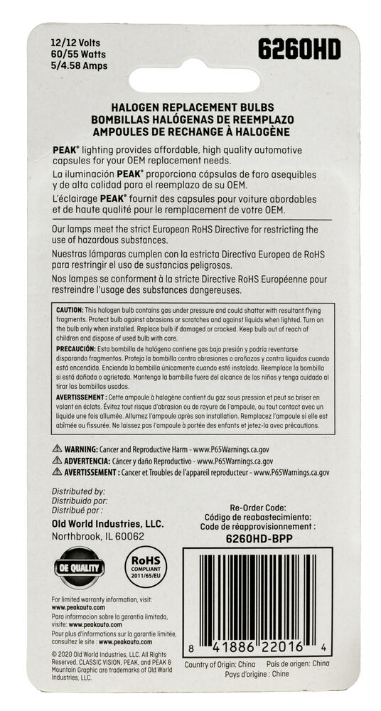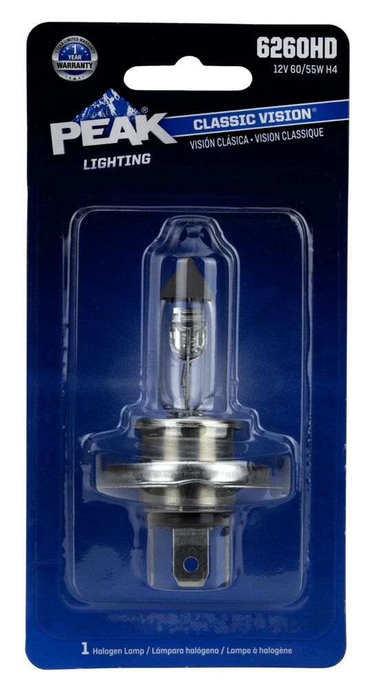 PEAK's Halogen interior and exterior bulbs are reliable, long-lasting OE Replacement Headelight. PEAK Halogen headlights produce light output that meets or exceeds OE specifications. Safe driving at night is important, and it starts with your headlights. The sooner you’re able to see an object on the road the quicker you can react. Make sure you’re headlights are performing properly and be sure to replace that with a high-performance headlight for increased visibility.