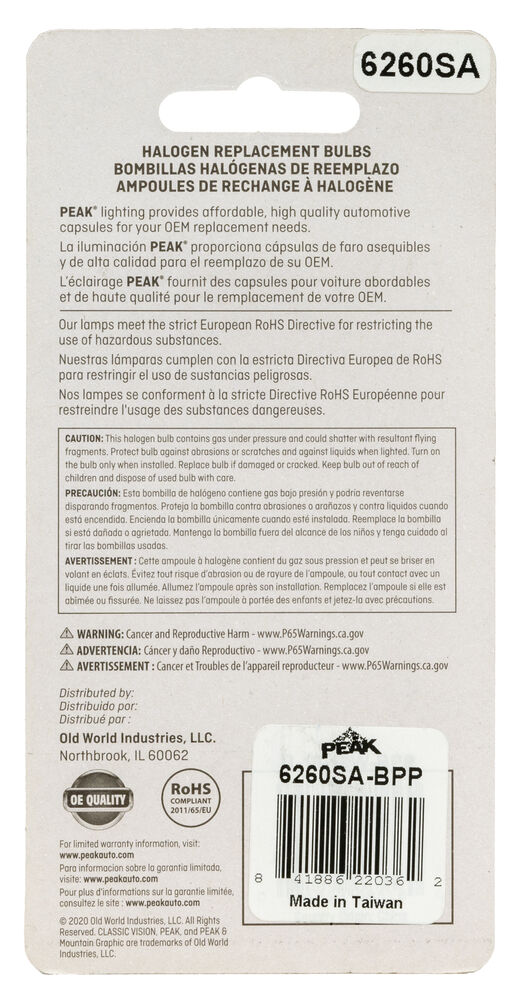 PEAK's Halogen interior and exterior bulbs are reliable, long-lasting OE Replacement Headelight. PEAK Halogen headlights produce light output that meets or exceeds OE specifications. Safe driving at night is important, and it starts with your headlights. The sooner you’re able to see an object on the road the quicker you can react. Make sure you’re headlights are performing properly and be sure to replace that with a high-performance headlight for increased visibility.