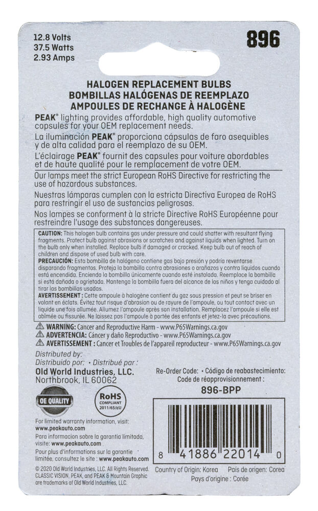 PEAK's Halogen interior and exterior bulbs are reliable, long-lasting OE Replacement Headelight. PEAK Halogen headlights produce light output that meets or exceeds OE specifications. Safe driving at night is important, and it starts with your headlights. The sooner you’re able to see an object on the road the quicker you can react. Make sure you’re headlights are performing properly and be sure to replace that with a high-performance headlight for increased visibility.
