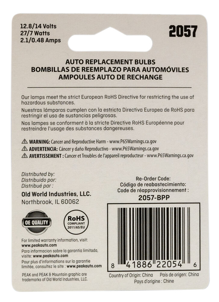 PEAK's interior and exterior bulbs are reliable, long-lasting OE Replacement Headelight. PEAK Halogen headlights produce light output that meets or exceeds OE specifications. Safe driving at night is important, and it starts with your headlights. The sooner you’re able to see an object on the road the quicker you can react. Make sure you’re headlights are performing properly and be sure to replace that with a high-performance headlight for increased visibility.