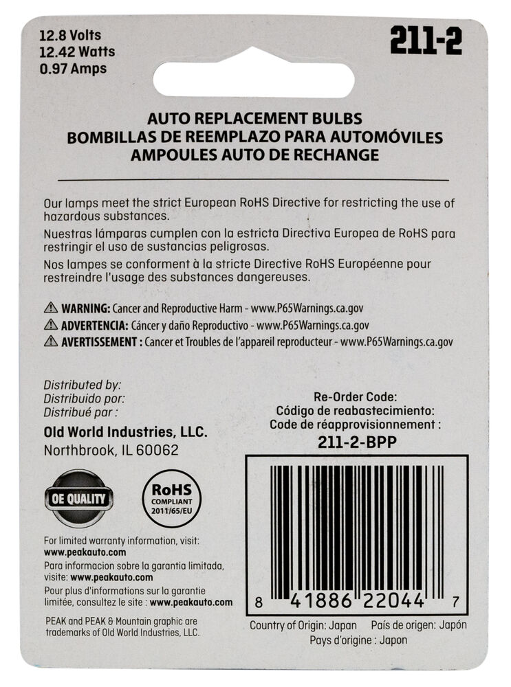 PEAK's interior and exterior bulbs are reliable, long-lasting OE Replacement Headelight. PEAK Halogen headlights produce light output that meets or exceeds OE specifications. Safe driving at night is important, and it starts with your headlights. The sooner you’re able to see an object on the road the quicker you can react. Make sure you’re headlights are performing properly and be sure to replace that with a high-performance headlight for increased visibility.