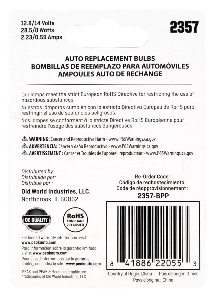 PEAK's interior and exterior bulbs are reliable, long-lasting OE Replacement Headelight. PEAK Halogen headlights produce light output that meets or exceeds OE specifications. Safe driving at night is important, and it starts with your headlights. The sooner you’re able to see an object on the road the quicker you can react. Make sure you’re headlights are performing properly and be sure to replace that with a high-performance headlight for increased visibility.