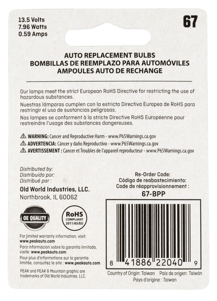 PEAK's interior and exterior bulbs are reliable, long-lasting OE Replacement Headelight. PEAK Halogen headlights produce light output that meets or exceeds OE specifications. Safe driving at night is important, and it starts with your headlights. The sooner you’re able to see an object on the road the quicker you can react. Make sure you’re headlights are performing properly and be sure to replace that with a high-performance headlight for increased visibility.