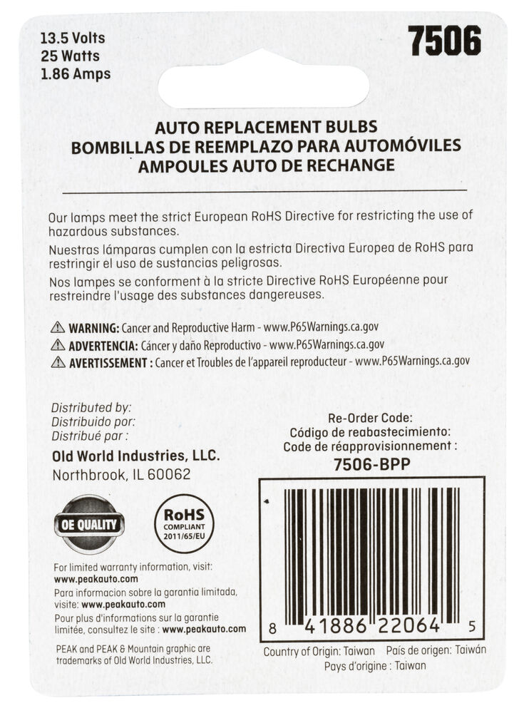 PEAK's interior and exterior bulbs are reliable, long-lasting OE Replacement Headelight. PEAK Halogen headlights produce light output that meets or exceeds OE specifications. Safe driving at night is important, and it starts with your headlights. The sooner you’re able to see an object on the road the quicker you can react. Make sure you’re headlights are performing properly and be sure to replace that with a high-performance headlight for increased visibility.