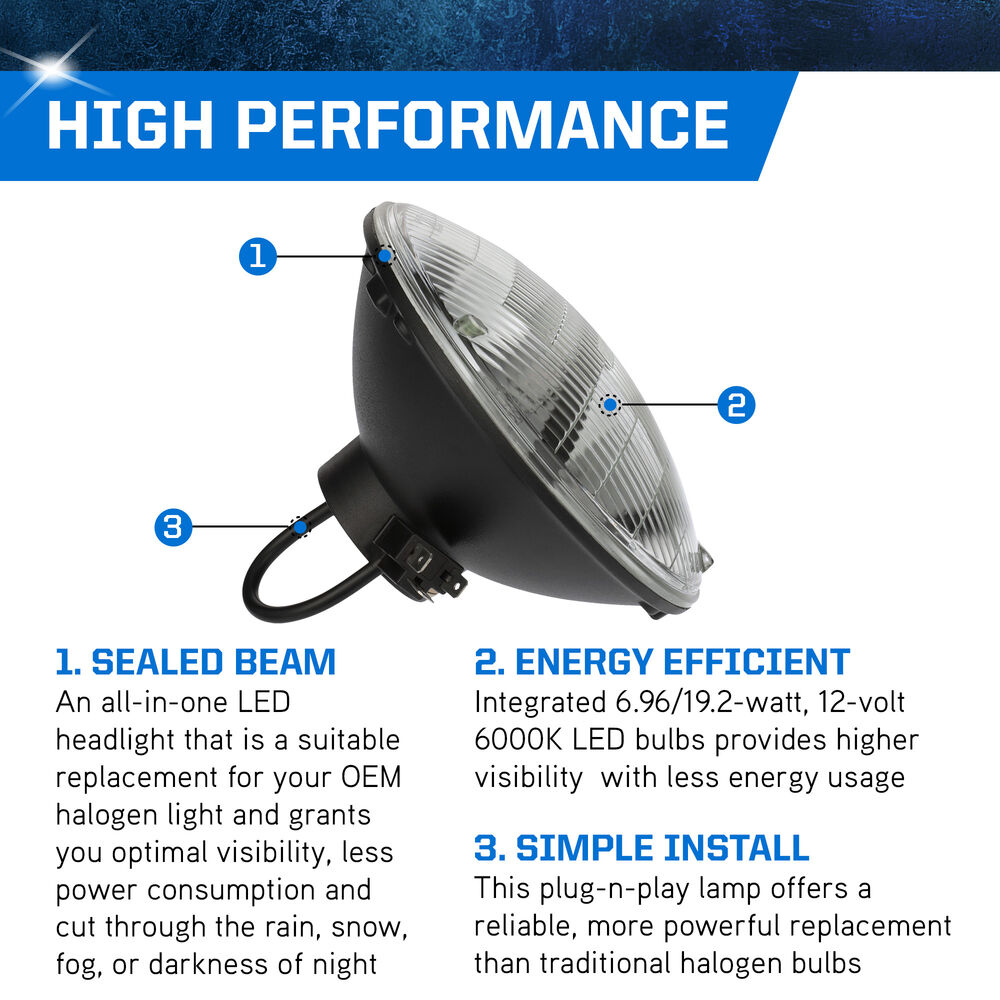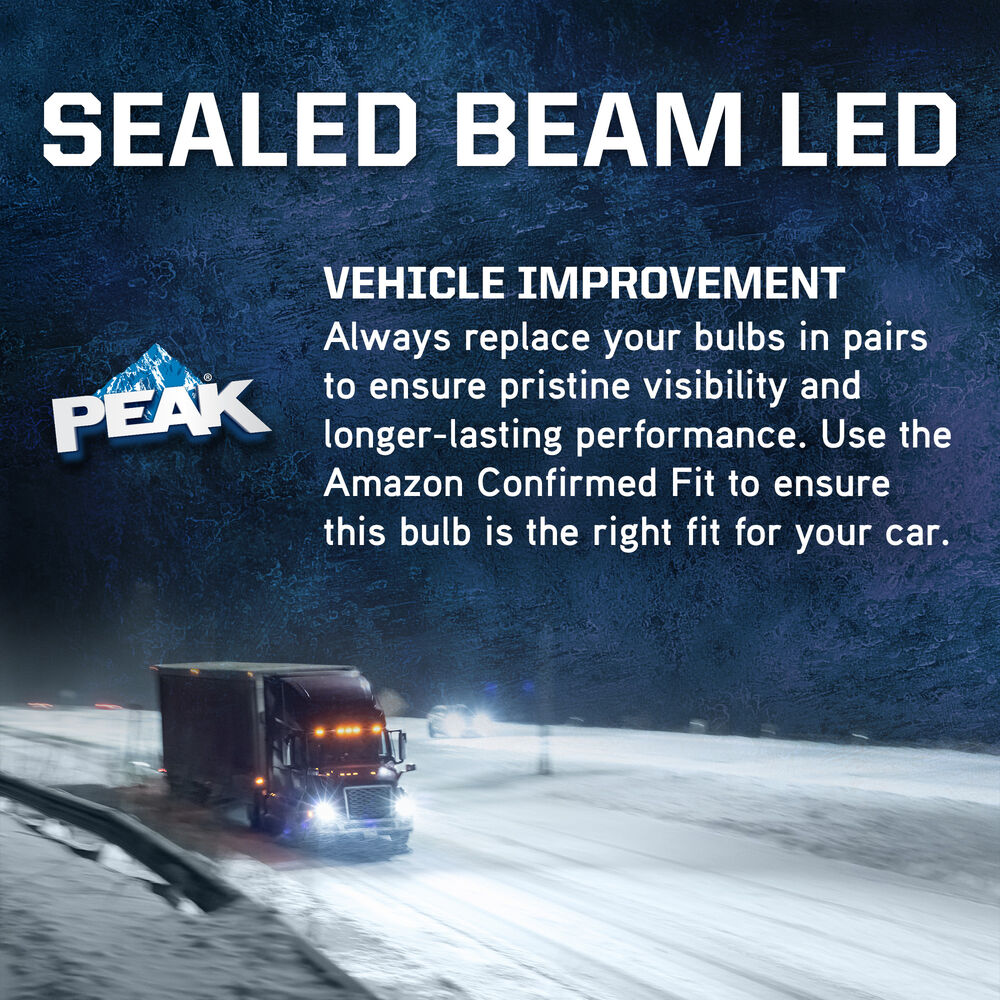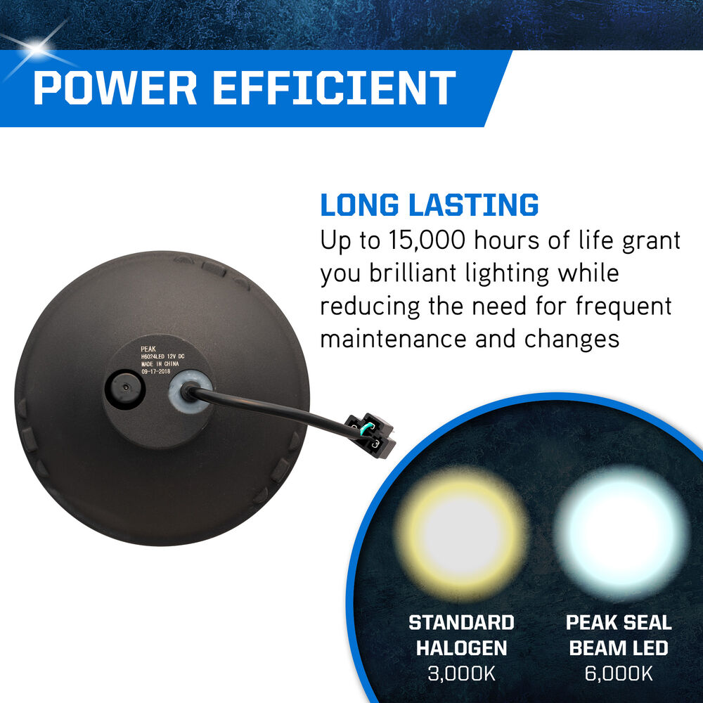 Give yourself the assurance and peace of mind that you need on the road with the PEAK Sealed Beam LED Headlight. This highly-powerful sealed LED lamp is a suitable replacement for standard halogen sealed beams, and grants more energy-efficient, brilliant light. This sealed-beam lamp replacement meets and even exceeds OE specifications. Thanks to the integrated 6.96/19.2-watt, 12-volt 6000K bright white LED light with consistent lumen output, you will be granted optimal visibility with less power consumption. In fact, this energy-efficient headlight beam provides up to 15000 hours of consistent life power, granting you a reliable automotive light beam while reducing the need for frequent maintenance and changes. This complete headlight is legal for on and off-road use, and is Department of Transportation (DOT) approved for quality assurance. Pair this LED headlight with another for your replacement to ensure the best performance and continued visibility.